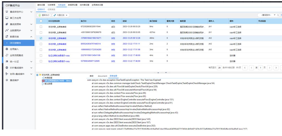 | 运行 | com.seeyon.v3x.dee.exception.DeeTaskExpireException: The Task has Expired! | DEE任务超期 | 使用DEE工具重新导出任务,如果是试用工具,需确保授权期限在有效期内。 | ![]() |