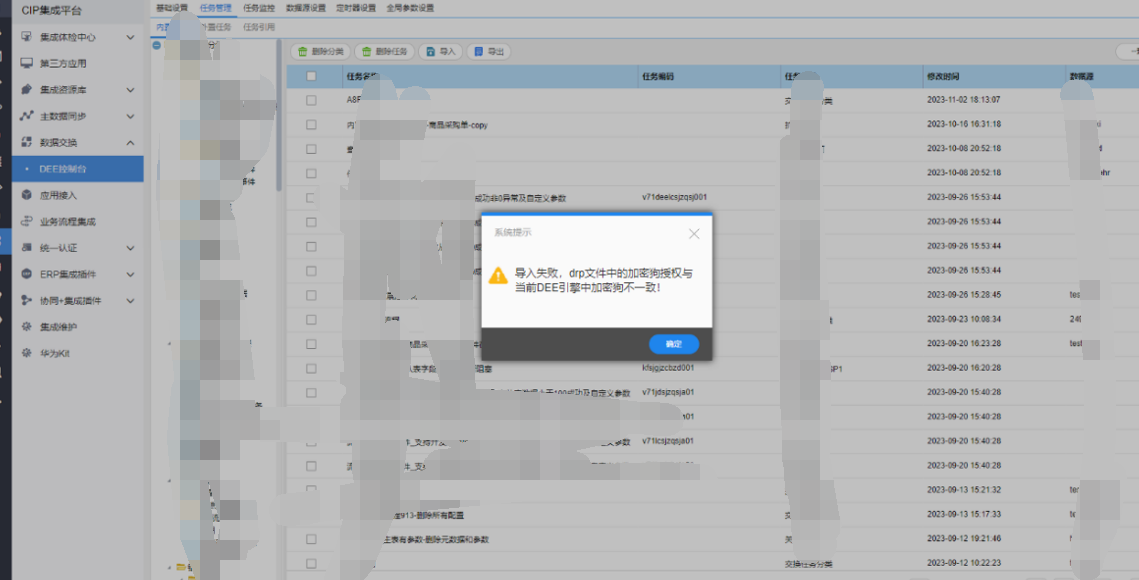 | 导入 | 导入失败,drp文件中的加密狗授权与当前DEE引擎中加密狗不一致! | 当前协同环境的加密狗号与导入的drp中的加密狗号不一致 | 使用狗号一致的DEE工具重新导出任务 | ![]() |