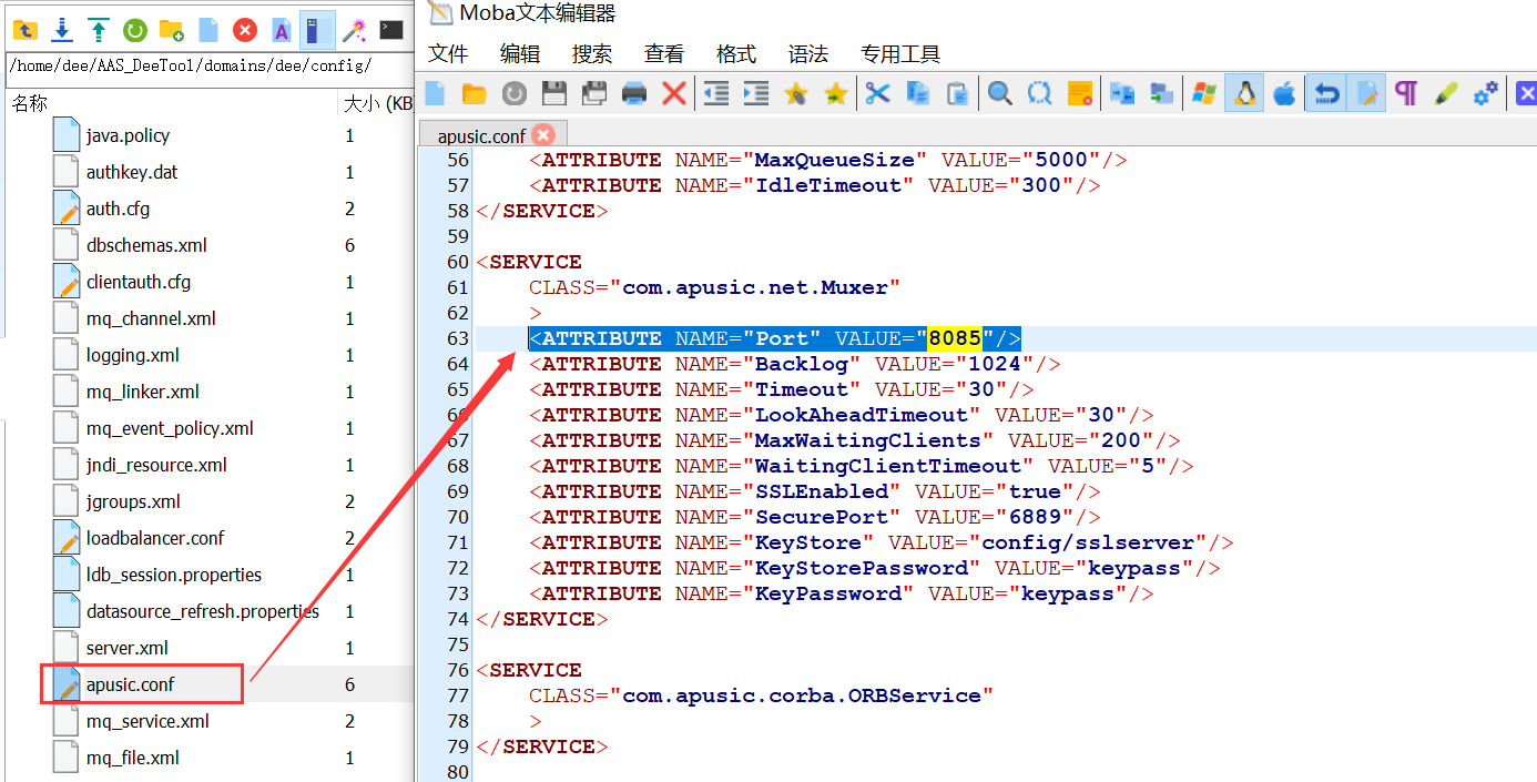 <SERVICE CLASS="com.apusic.net.Muxer" >中修改port属性6888 为 8085
