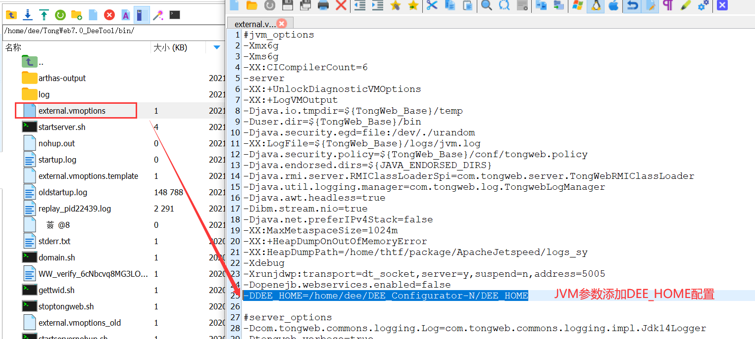 - 进入${TongWeb _HOME}/bin/下,在external.vmoptions文件添加DEE_HOME的配置:-DDEE_HOME= ${DEE_Configurator-N_HOME}/DEE_HOME