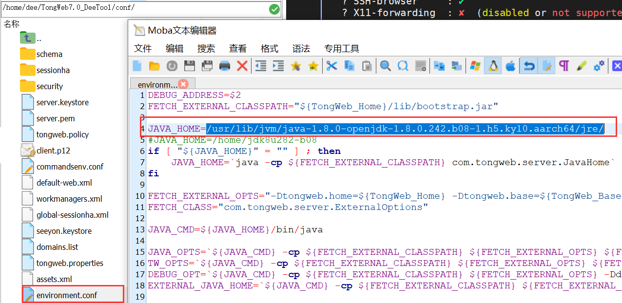 - 进入${TongWeb _HOME}/conf/下,修改environment.conf文件的JAVA_HOME配置为环境的jdk目录,如: