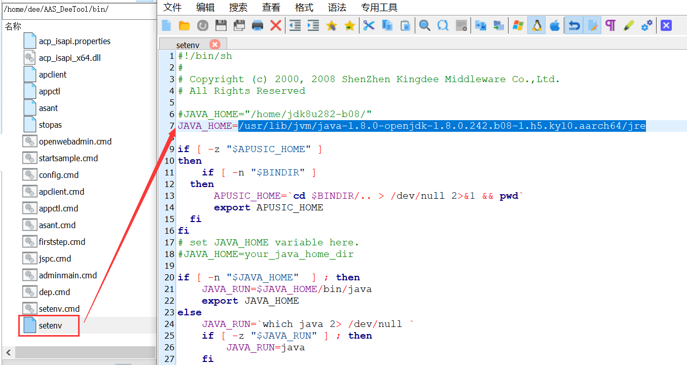 进入${AAS_HOME}/bin下,修改setenv文件的JAVA_HOME配置为环境的jdk目录,如: