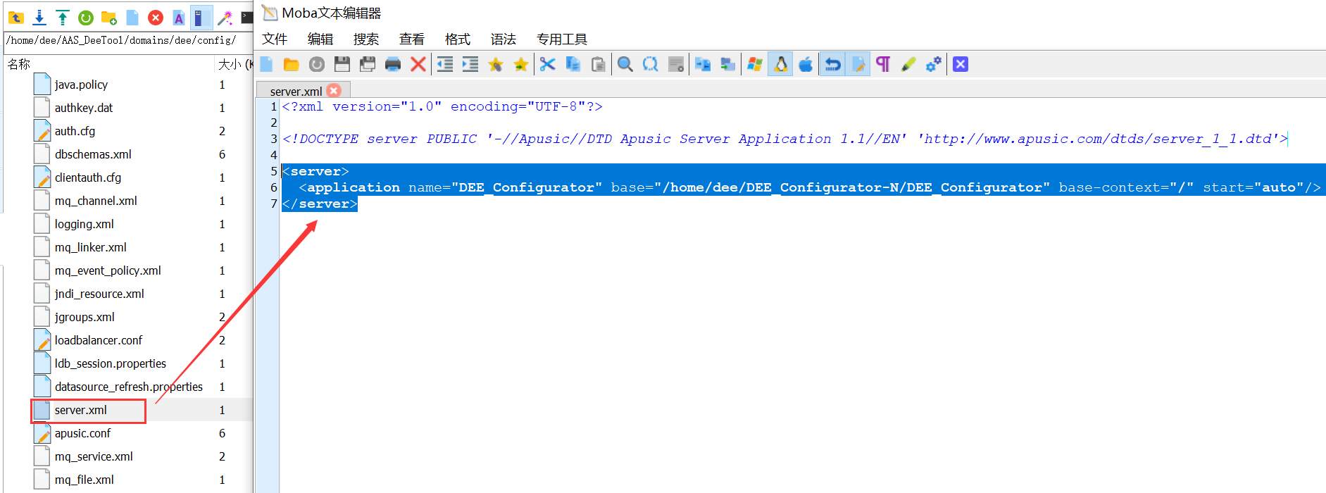 进入域${AAS_HOME}/domains/dee/config/server.xml添加项目部署配置如下: