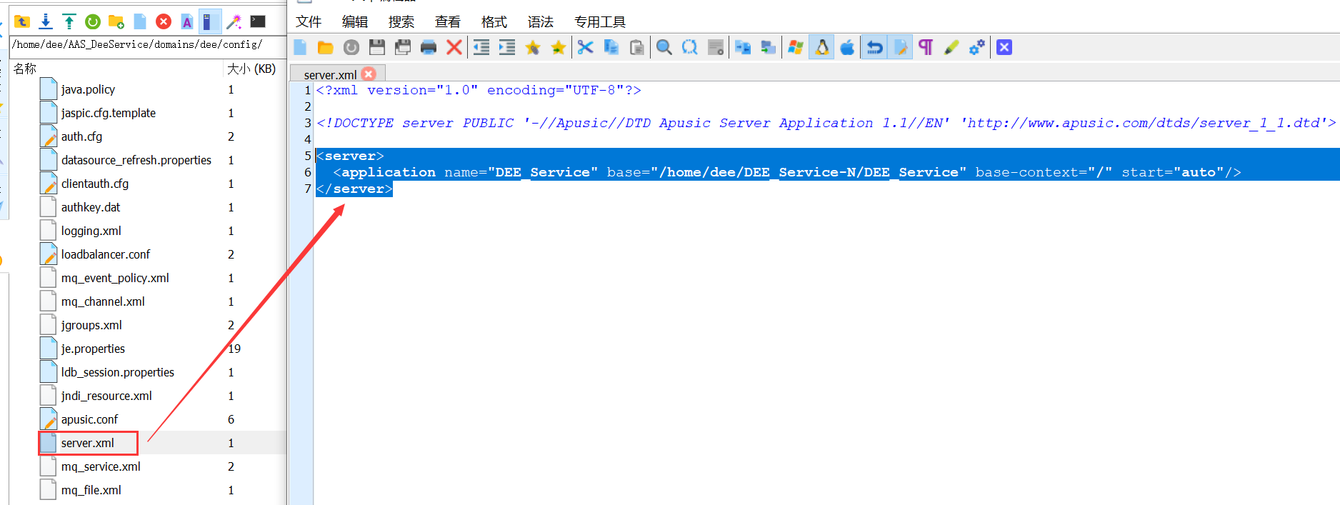 进入域${AAS_HOME}/domains/dee/config/server.xml添加项目部署配置如下: