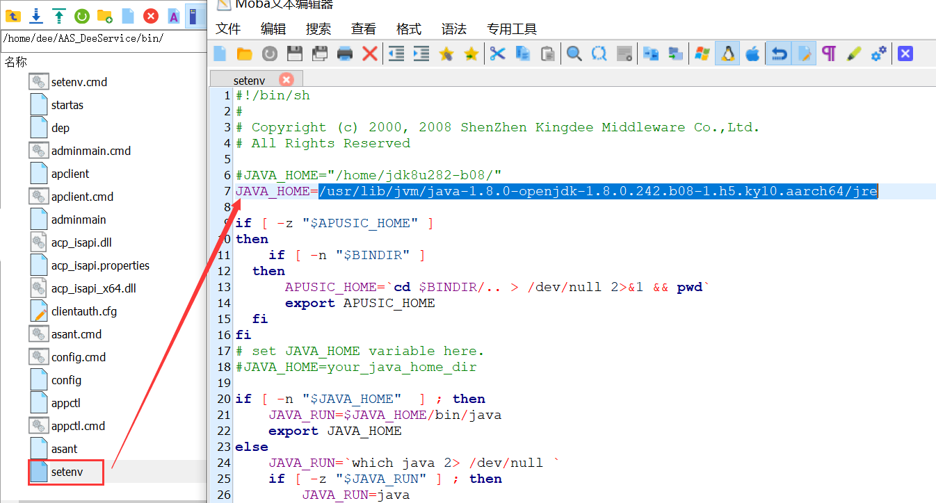 进入${AAS_HOME}/bin下,修改setenv文件的JAVA_HOME配置为环境的jdk目录,如: