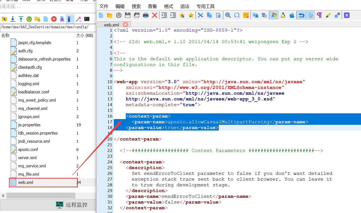 修改文件:${AAS_HOME}/domains/dee/config/web.xml,添加文件上传配置: