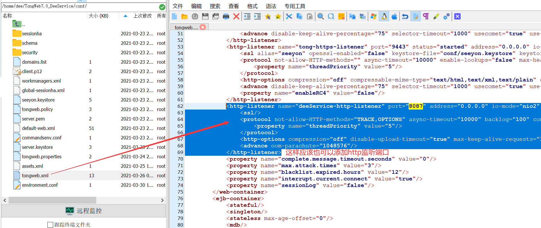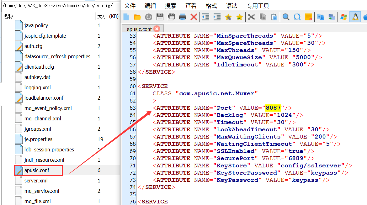 打开${AAS_HOME}/domains/dee/config/apusic.conf文件, 在标签