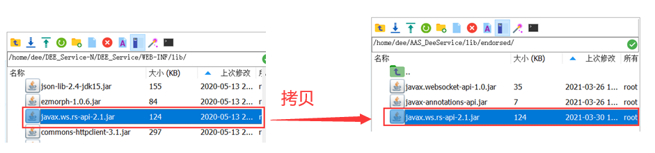将${DEE_Service-N_HOME}/DEE_Service/WEB-INF/lib/下的javax.ws.rs-api-2.1.jar 拷贝到金蝶${AAS_HOME}/lib/endorsed下