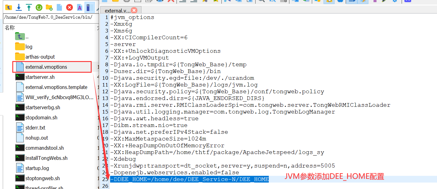 - 进入${TongWeb _HOME}/bin/下,在external.vmoptions文件添加DEE_HOME的配置:-DDEE_HOME= ${DEE_Service-N-HOME}/DEE_HOME