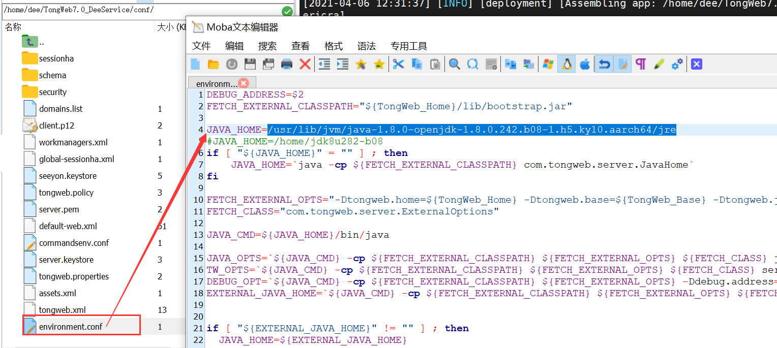 - 进入${ TongWeb _HOME}/conf/下,修改environment.conf文件的JAVA_HOME配置为环境的jdk目录,如: