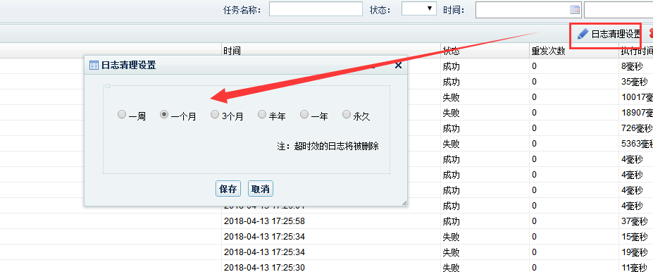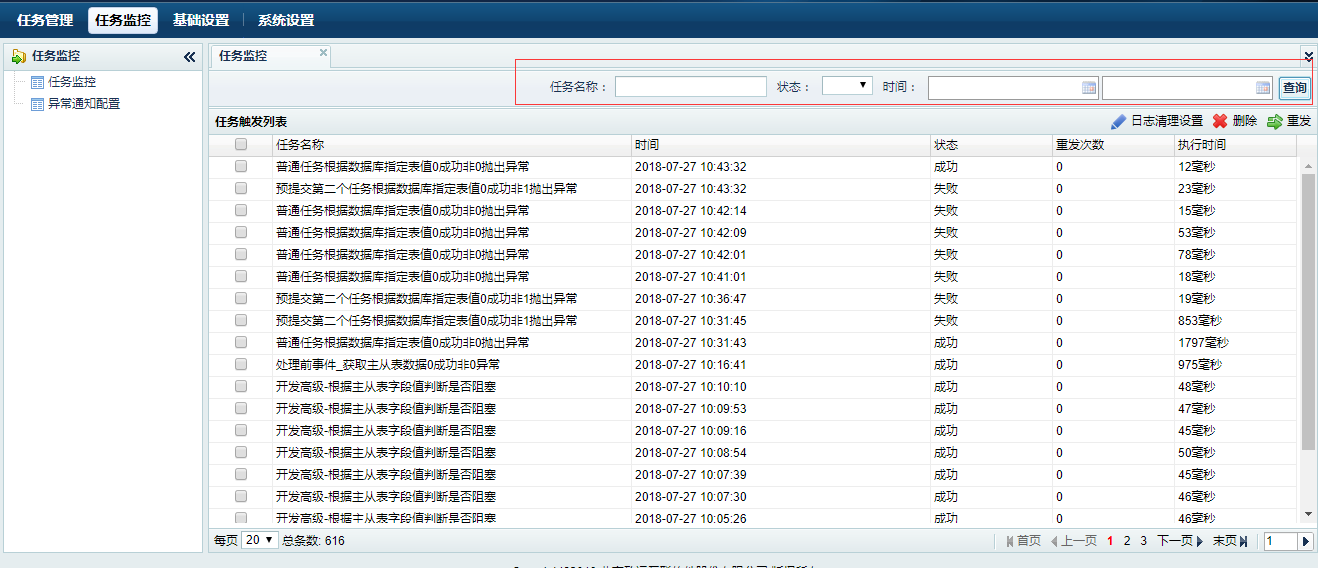 - 可通过 "任务名称","状态","时间",组合查询任务监控记录