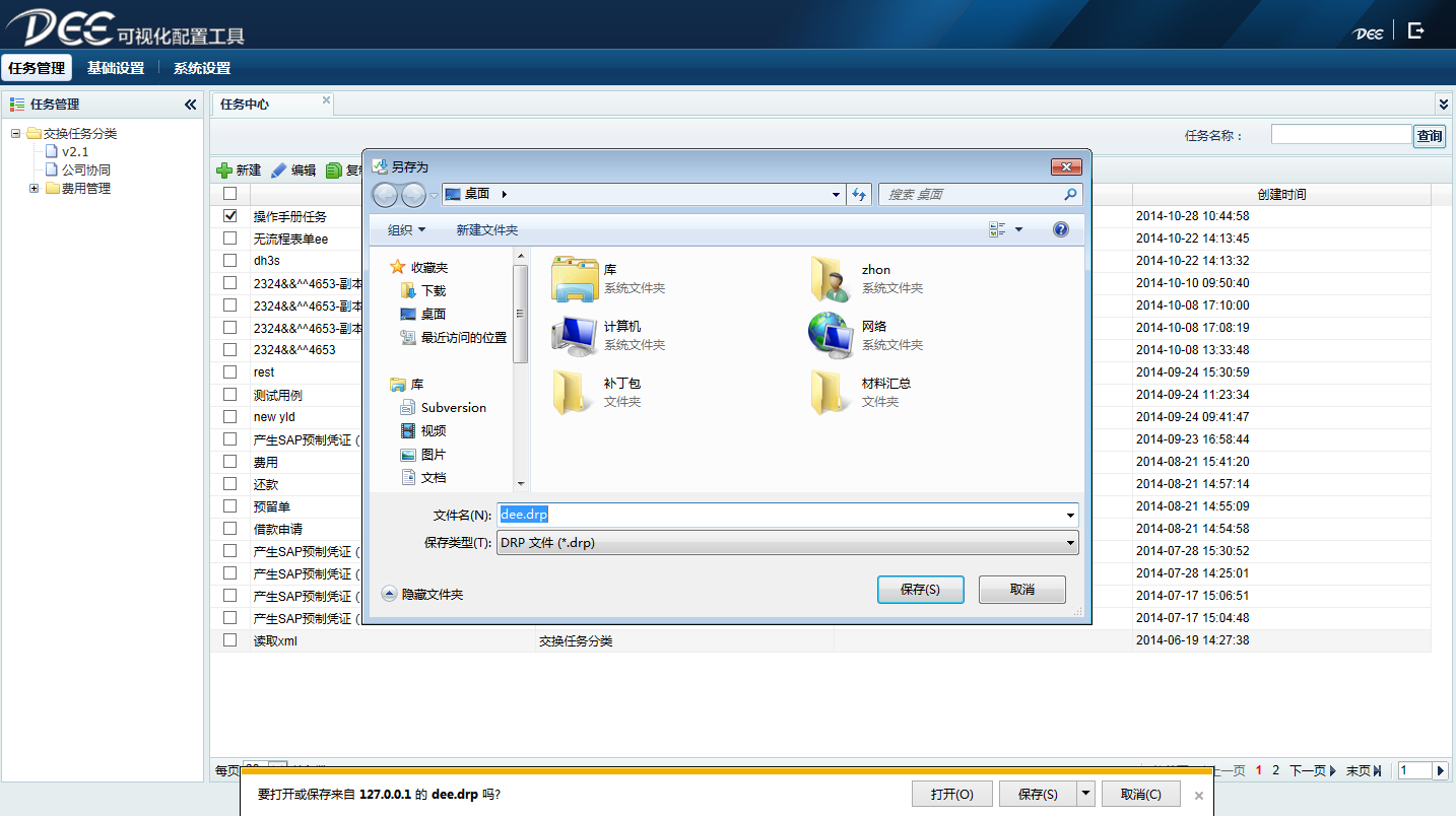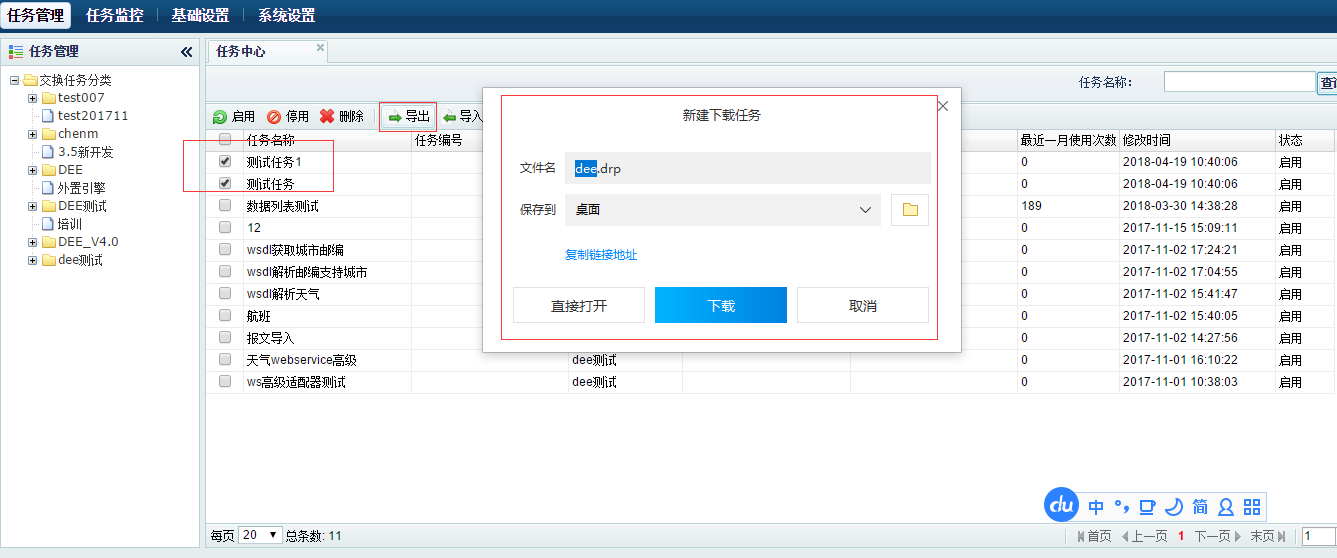 当需要对已在服务端使用的dee任务进行修改,可以通过任务管理的任务导出功能,把任务导出到本地,上传到dee配置工具里进行修改
