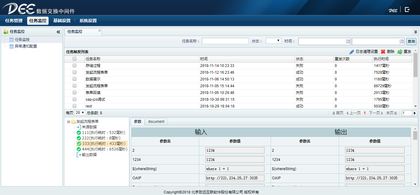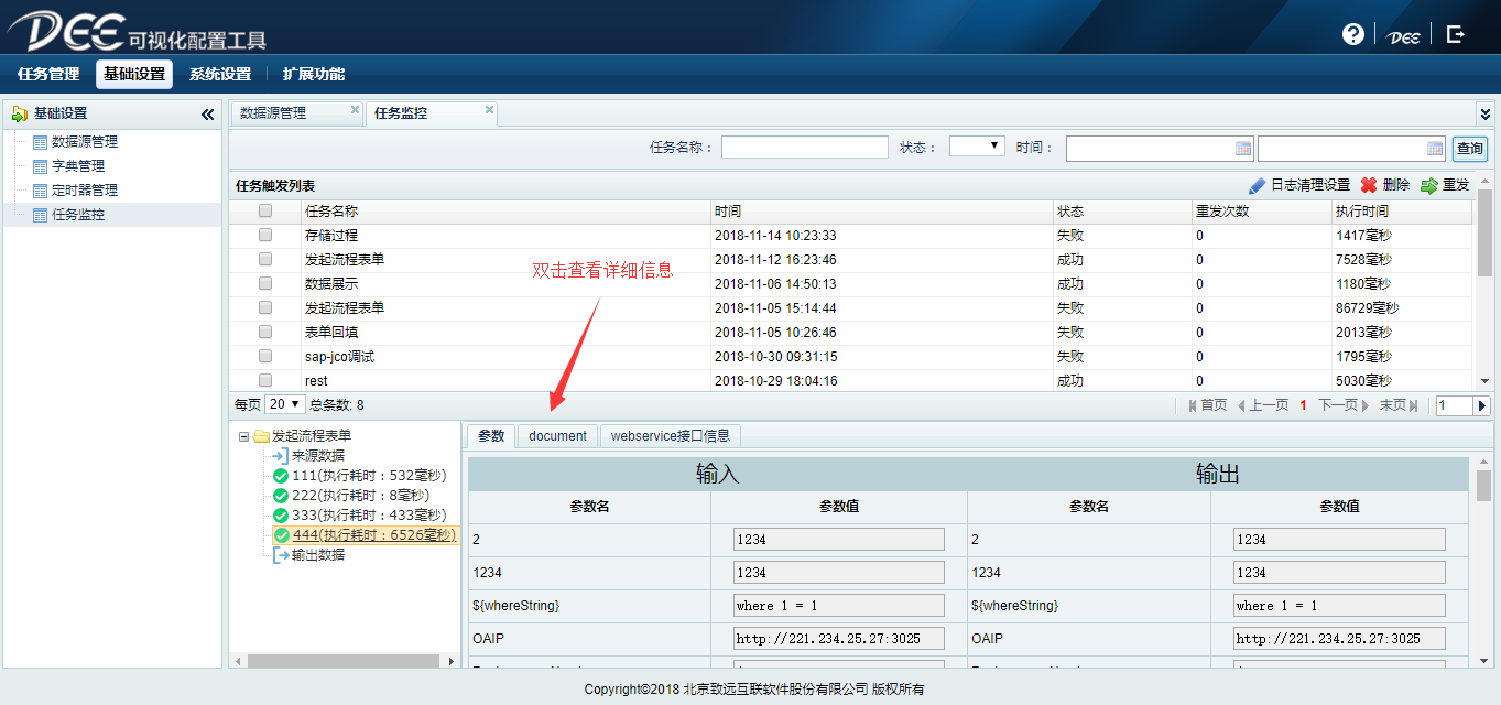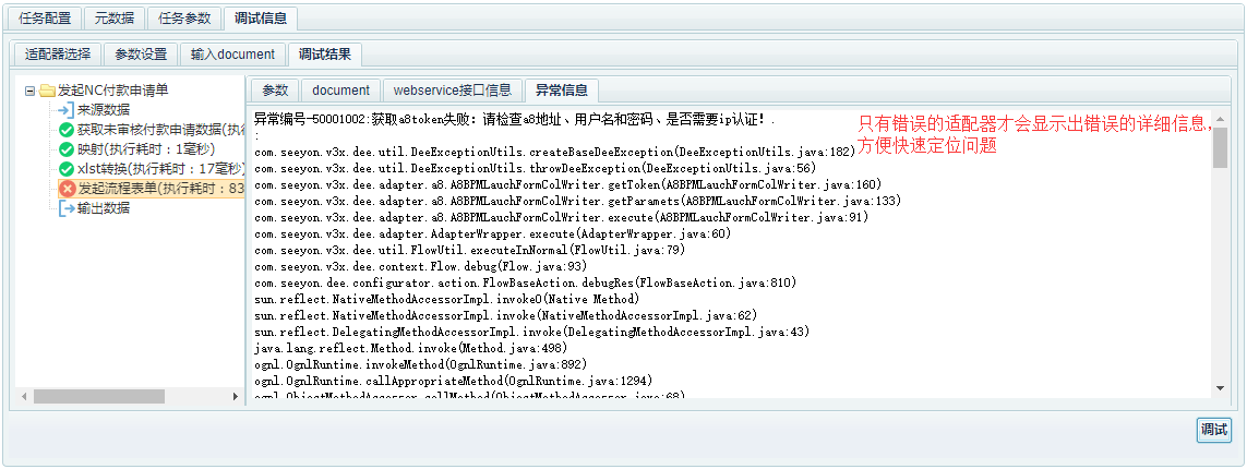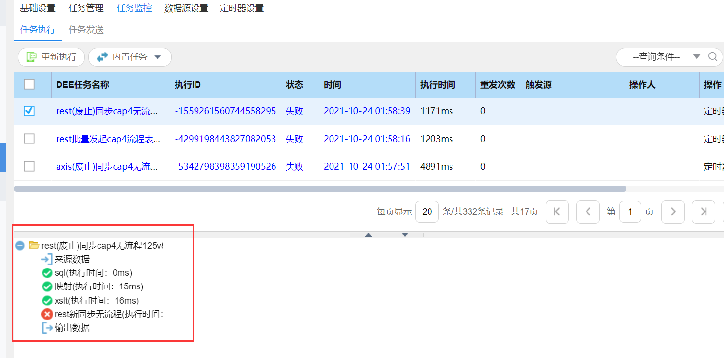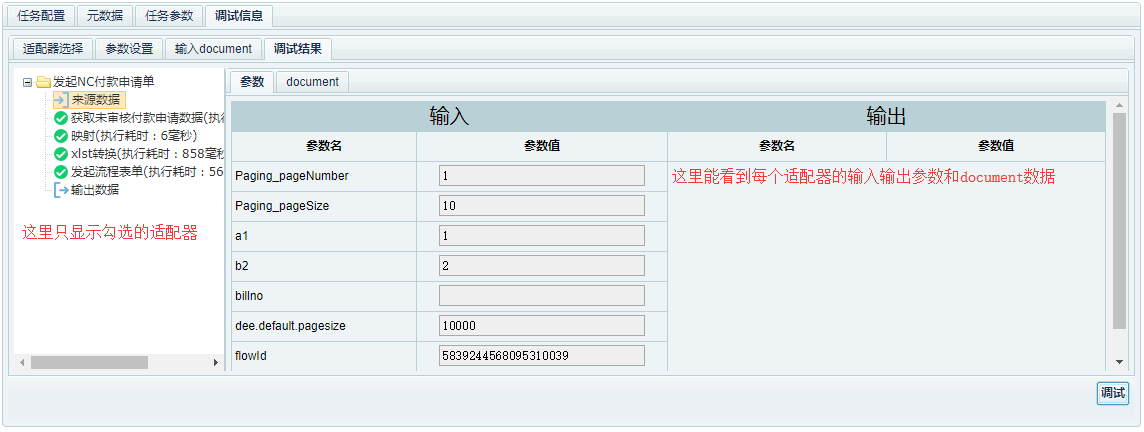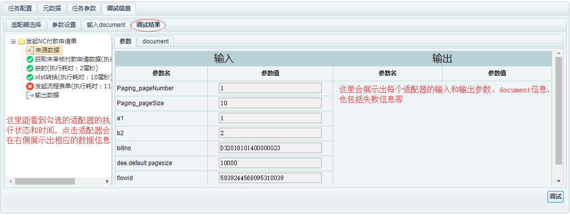 - 双击一行任务监控记录,可显示该任务监控记录详细信息,里面包含了任务的初始数据,每个适配器的执行状态,异常信息,参数信息,以及任务输出数据