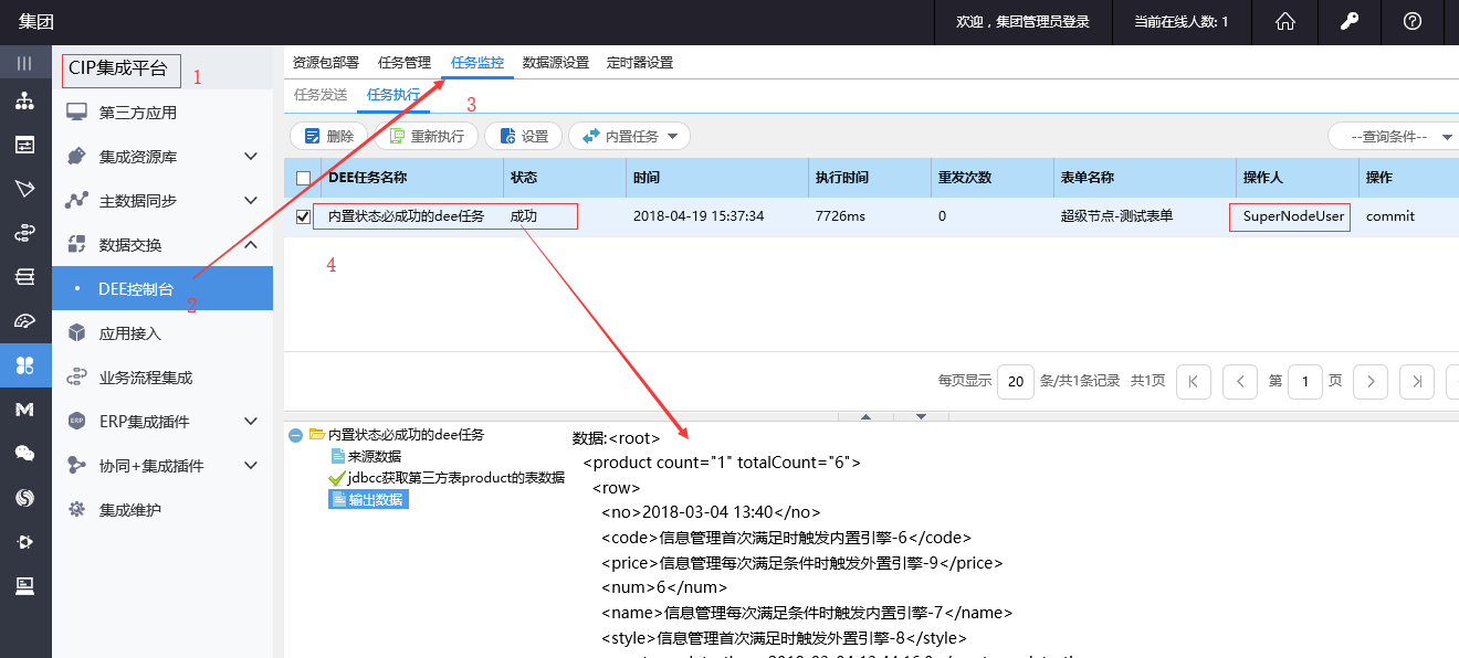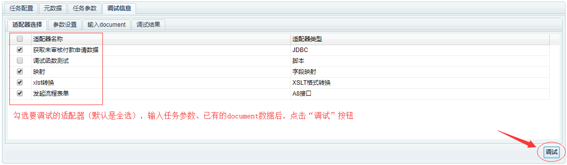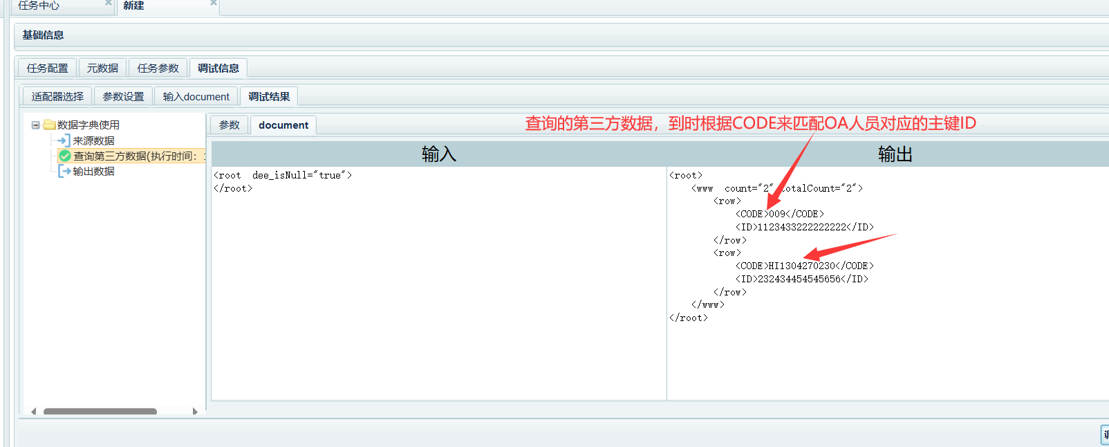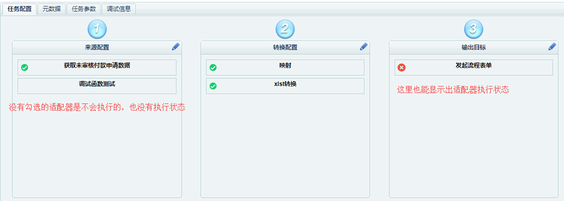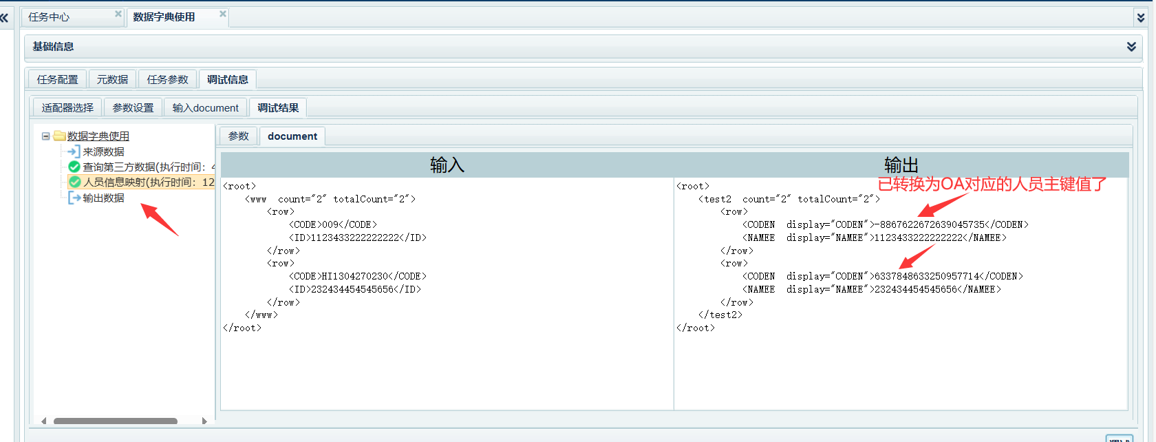 - 双击一行任务监控记录,可显示该任务监控记录详细信息,里面包含了任务的初始数据,每个适配器的执行状态,异常信息,参数信息,以及任务输出数据