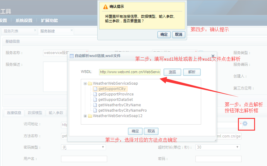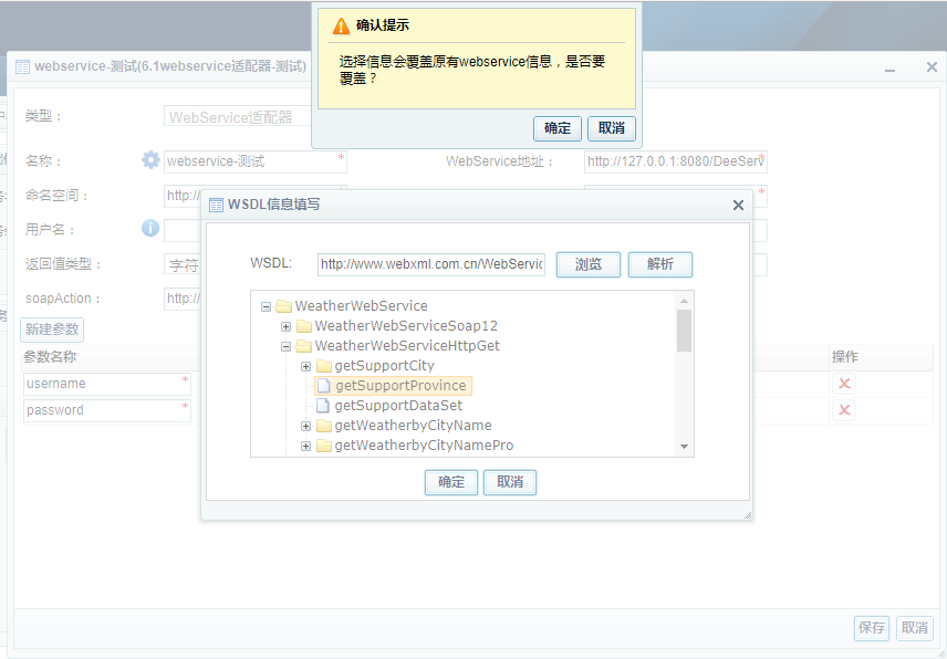 选择需要的方法,则相应的webservice信息会回填到适配器,会覆盖原有的webservice信息,如图5, 图6;