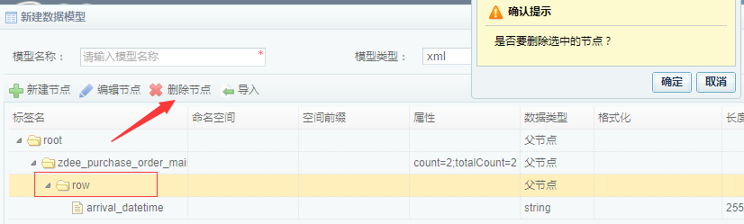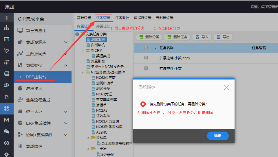 **第四步:**选择左边树节点,点击【删除】按钮,如果当前节点没有关联任务,也没有子节点,则删除当前节点,否则给予错误提示,如图2。