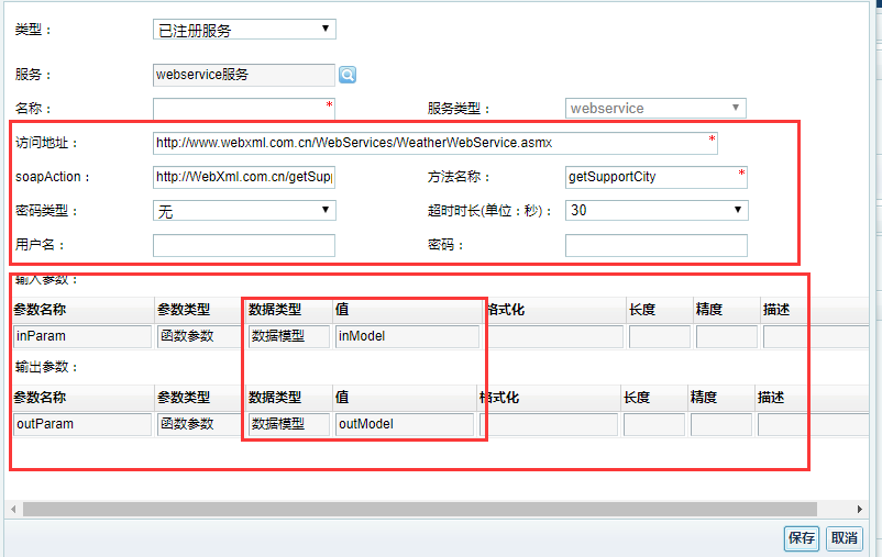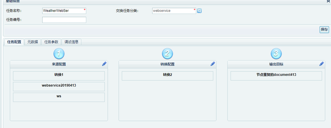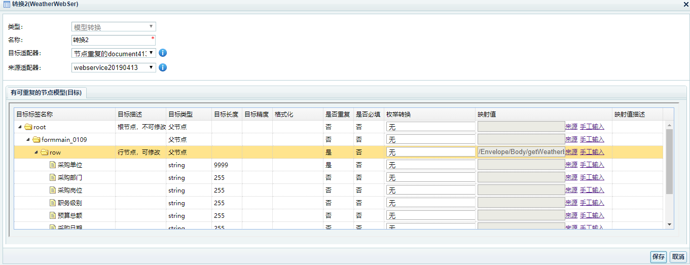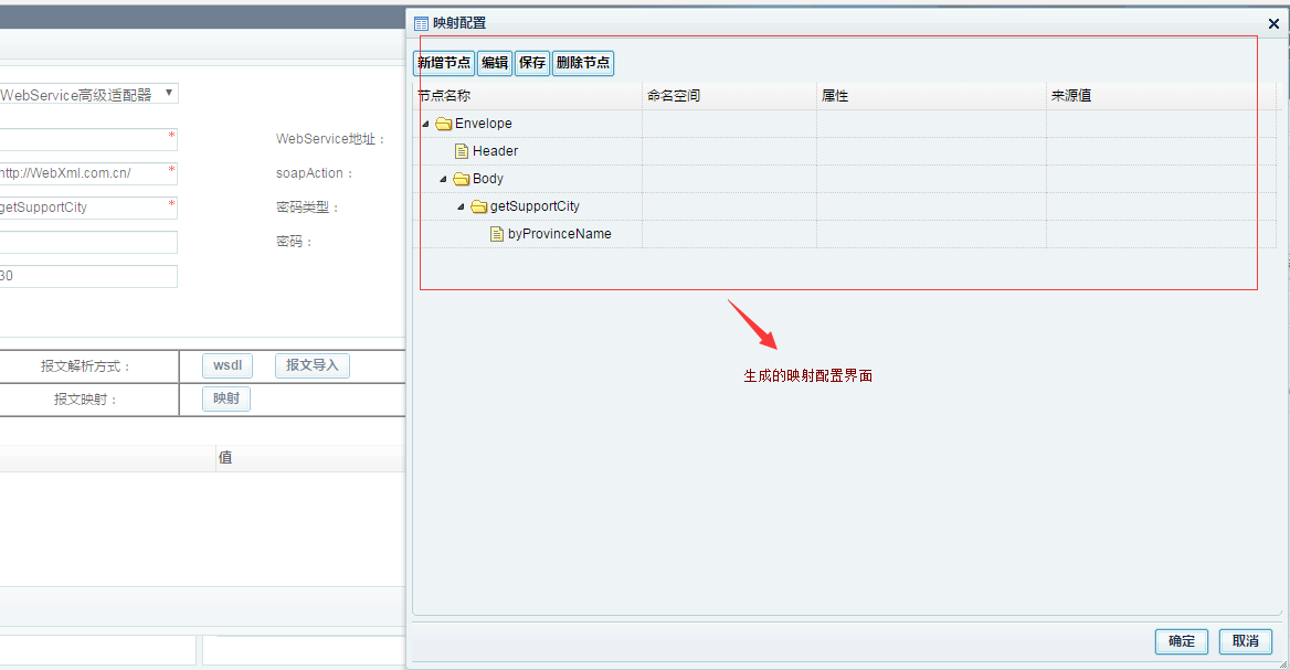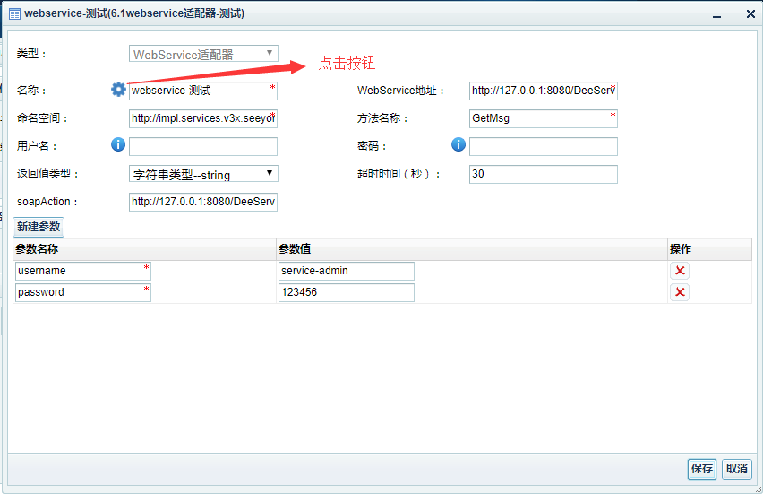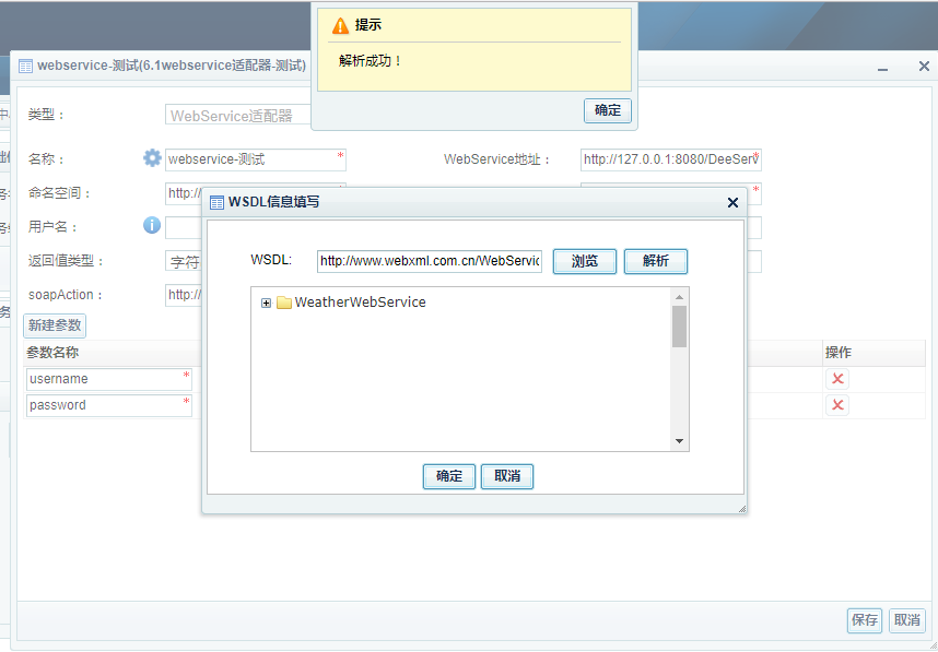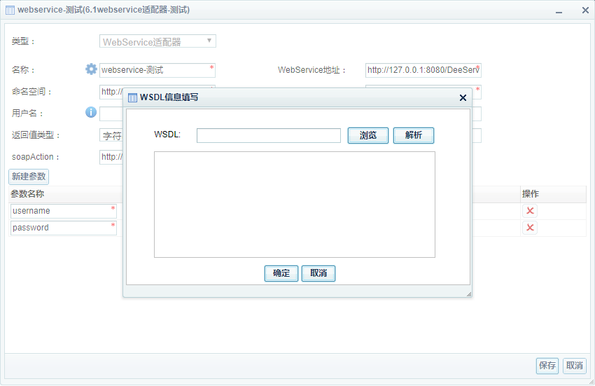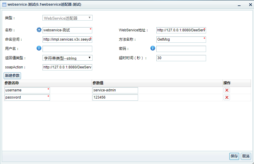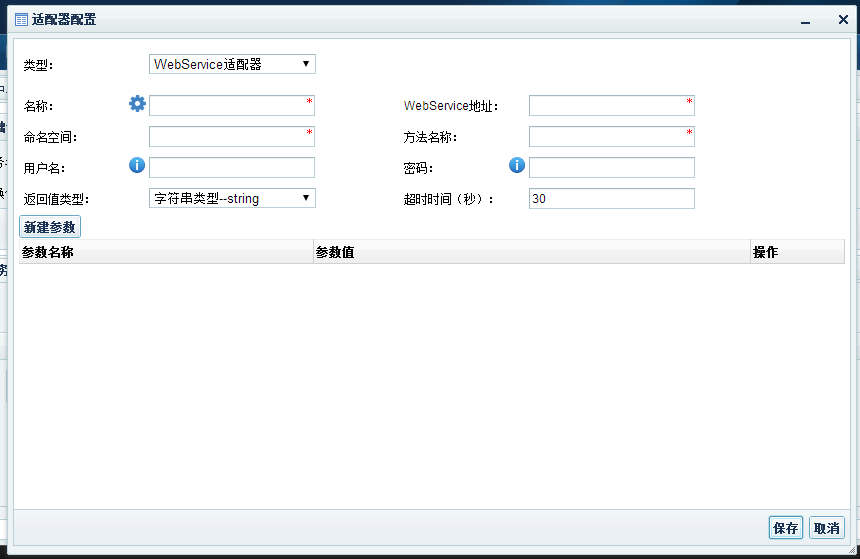 图标,选择来源类型【WEBService适配器】,填写名称,WebService地址,命名空间,方法名称,返回值类型,入参名称以及参数值,如图1;