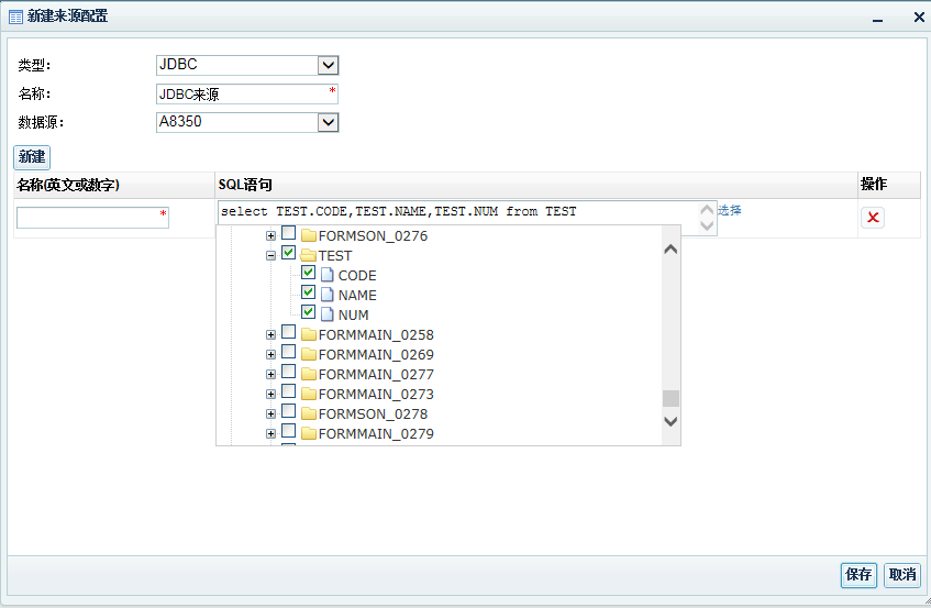 **第三步:**录入名称,SQL语句可以用户自己填写,也可以点击【选择】如图4。勾选库字段自动生成SQL语句。点击末尾图标可以删除该行录入;