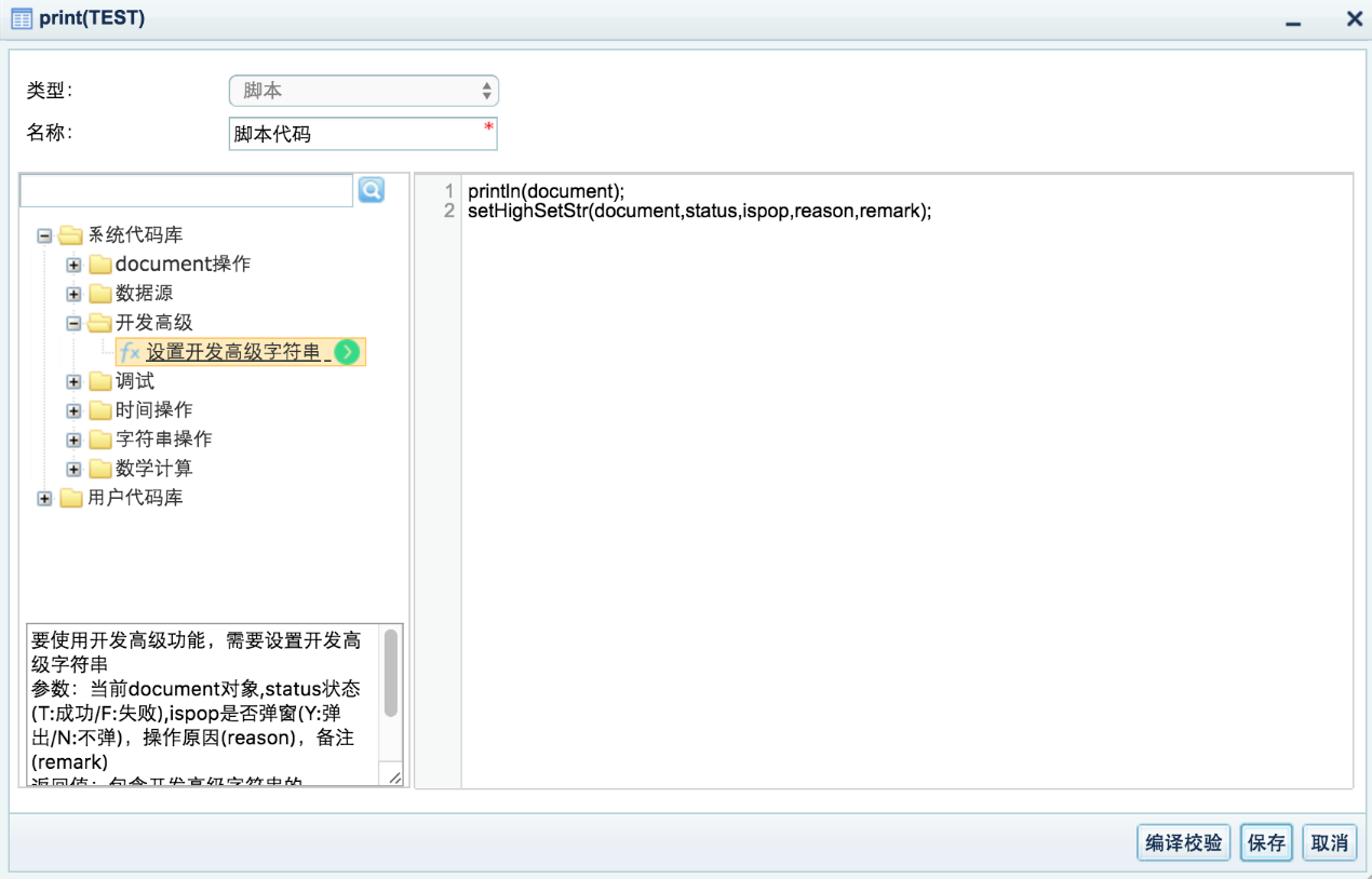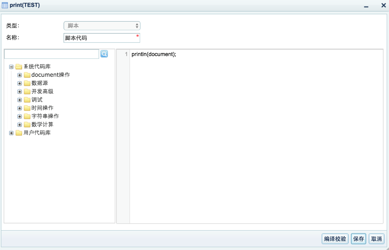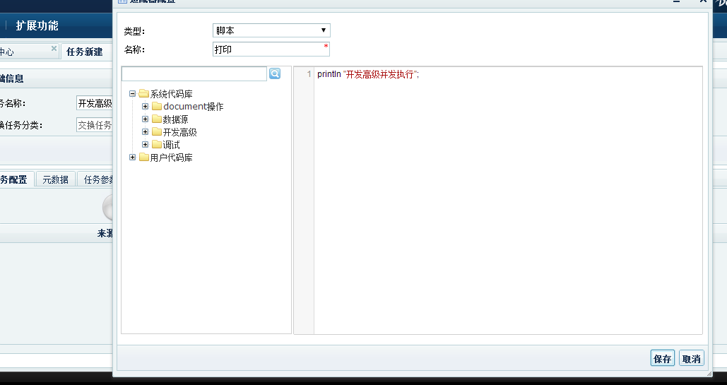 2.脚本适配器左侧为"系统代码库"与"用户代码库","系统代码库"是系统提供的内置函数,用于操作脚本,目前分为"document操作","数据源","开发高级","调试"四大类,如图2;