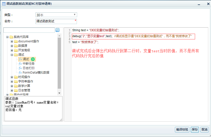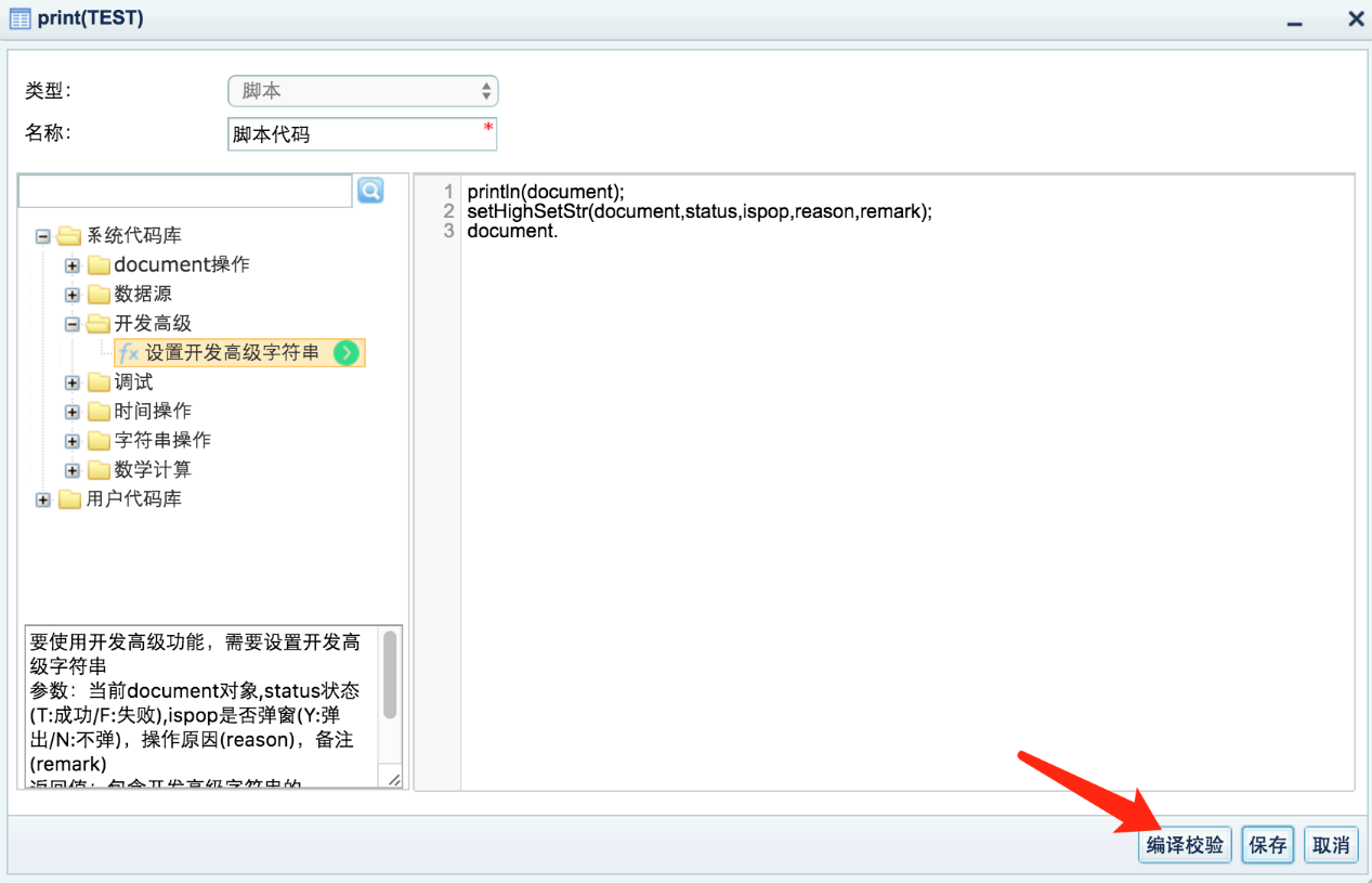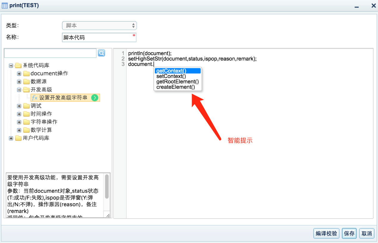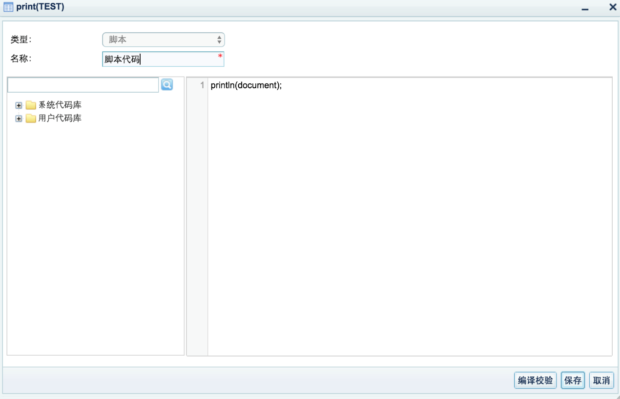 2.脚本适配器左侧为"系统代码库"与"用户代码库","系统代码库"是系统提供的内置函数,用于操作脚本,目前分为"document操作","数据源","开发高级","调试"四大类,如图2;