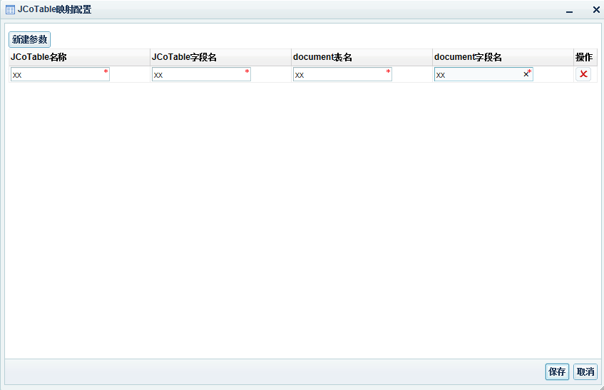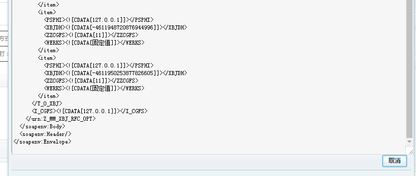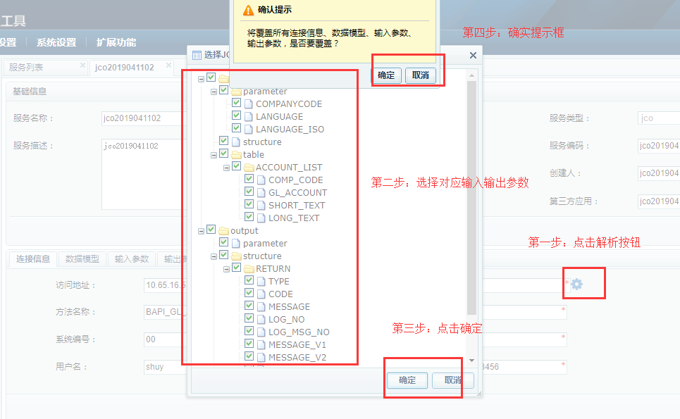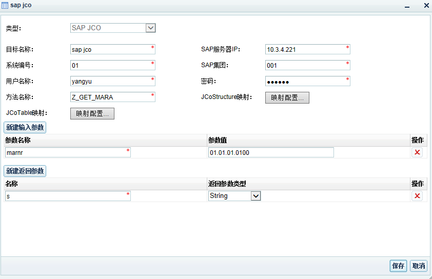 JCO】,填写名称,SAP服务器IP,SAP系统编号,SAP集团,用户名称,密码,方法名称,返回参数,入参名称以及参数值。如图1