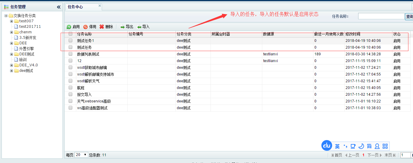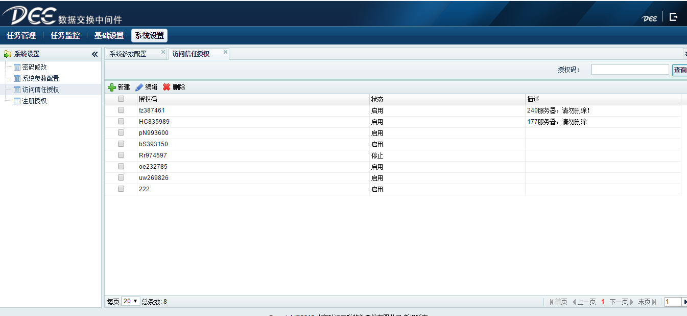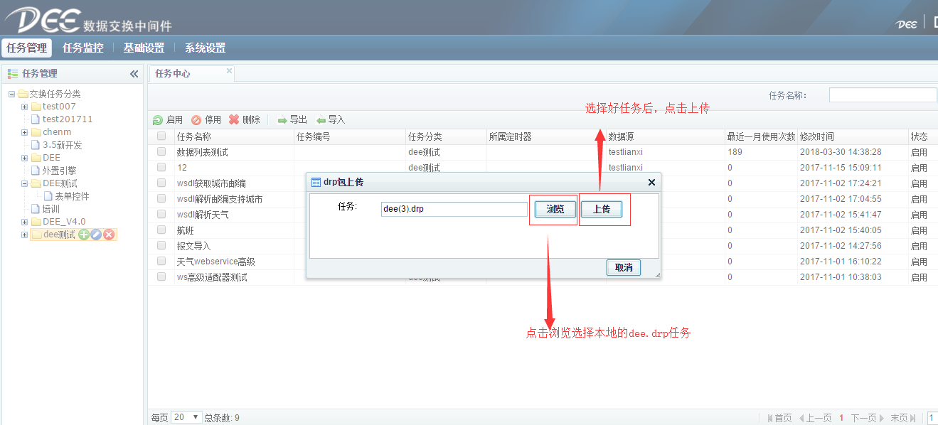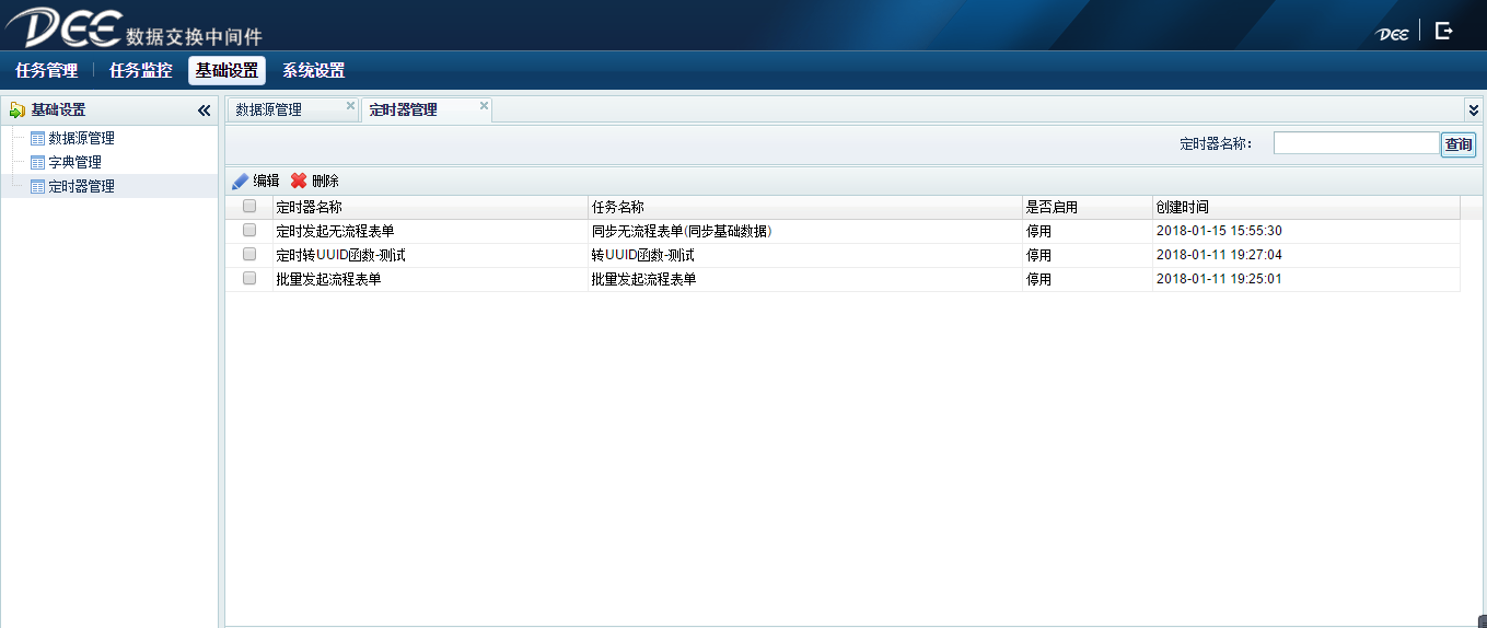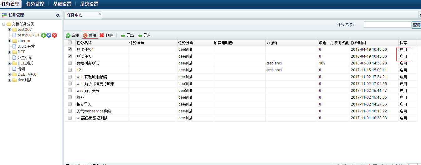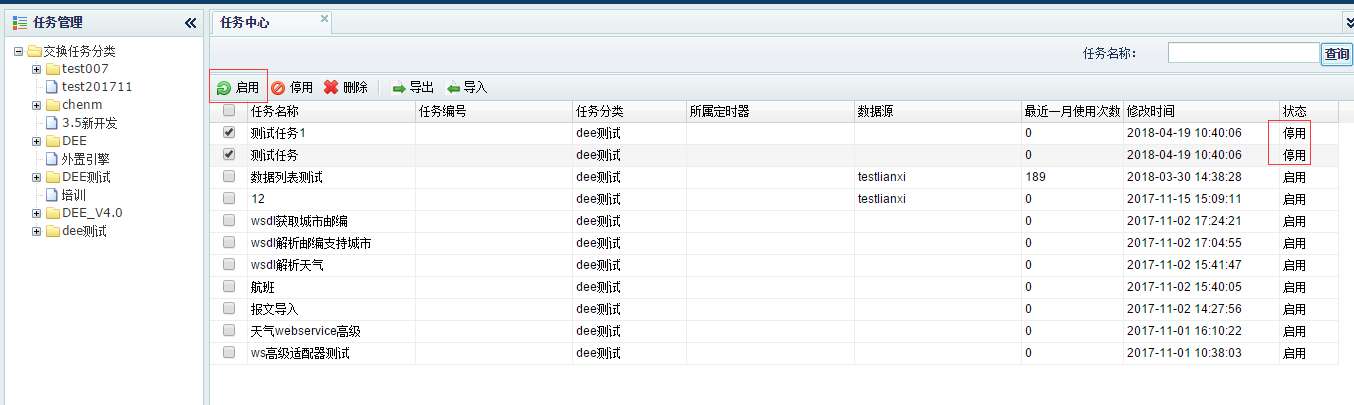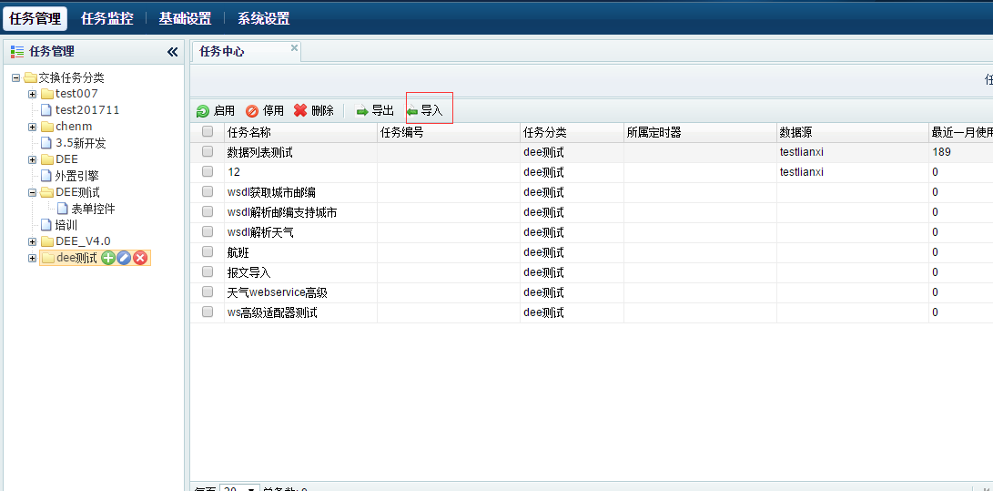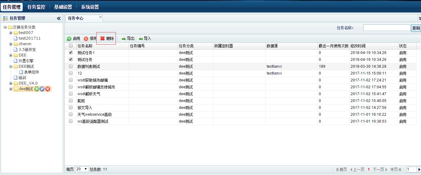 提供对dee任务的查看,删除,导入,导出,启动,停止操作