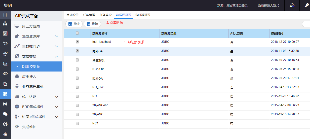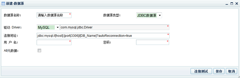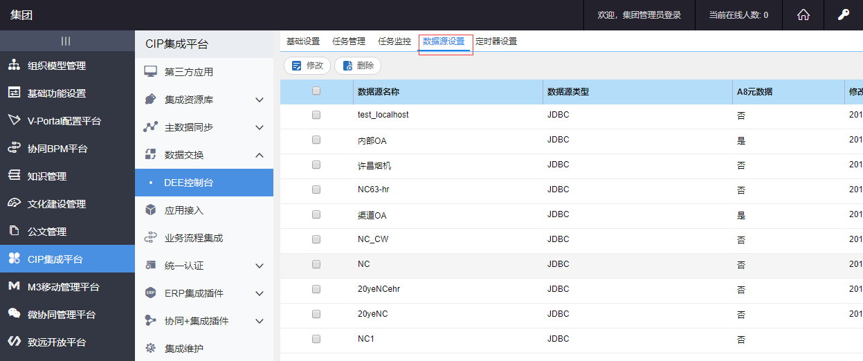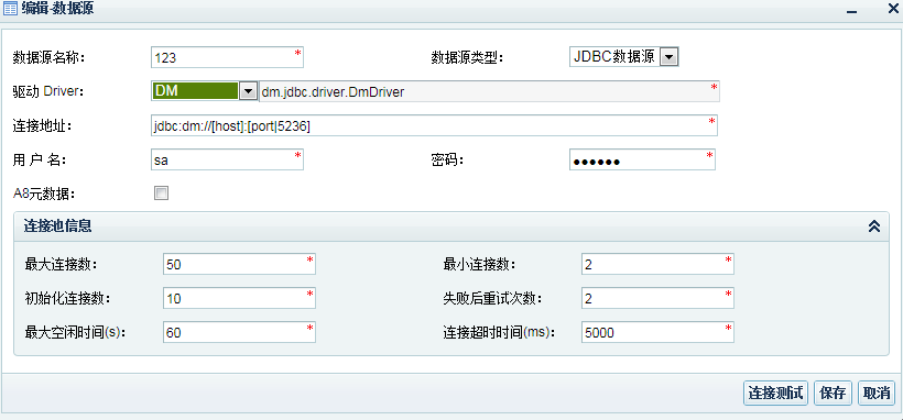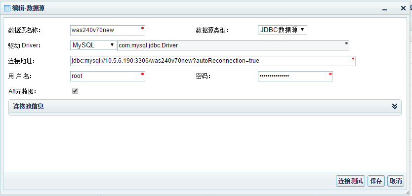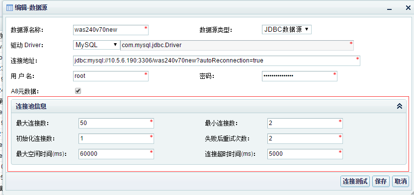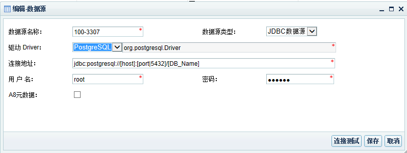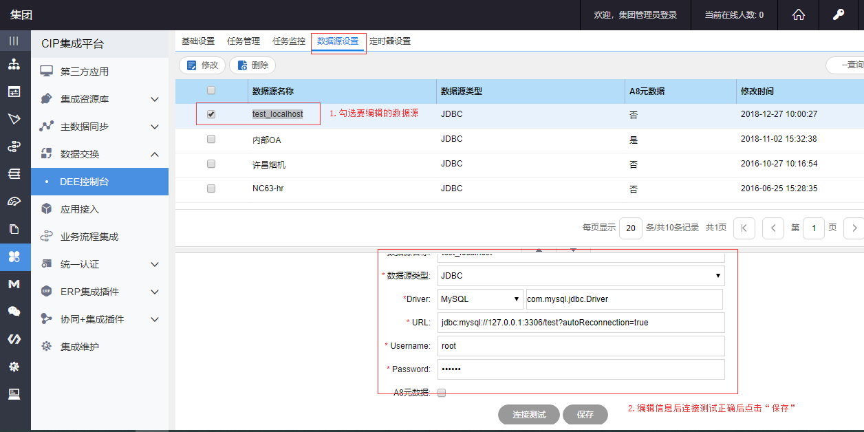 - 在数据源管理页签中,点击编辑按钮,将弹出数据源编辑界面