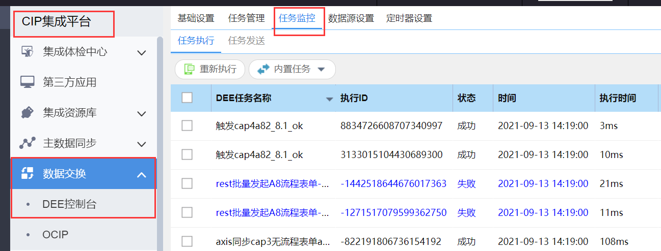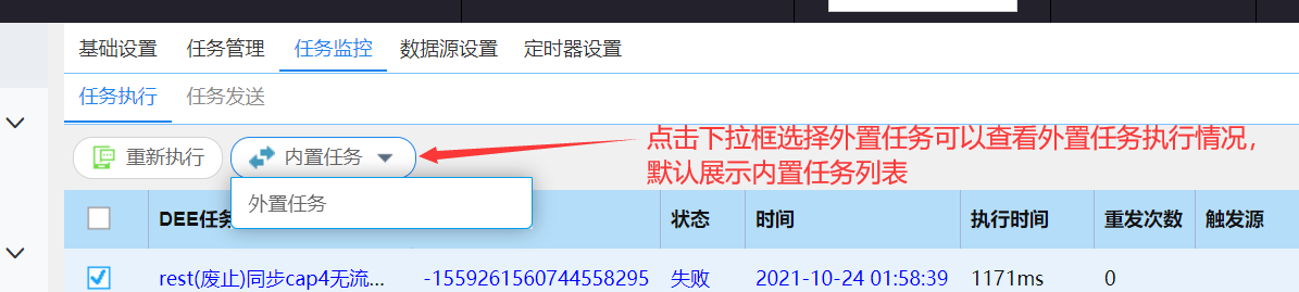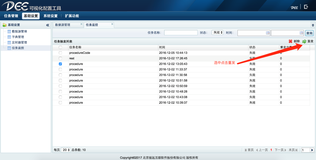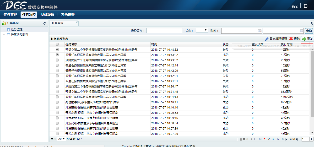 - 勾选一行或多行"失败"状态的任务监控记录,可重发