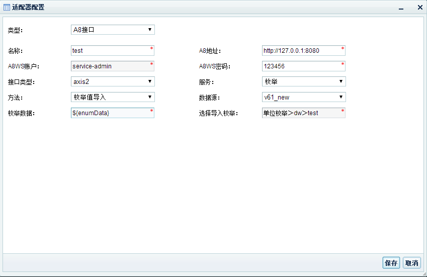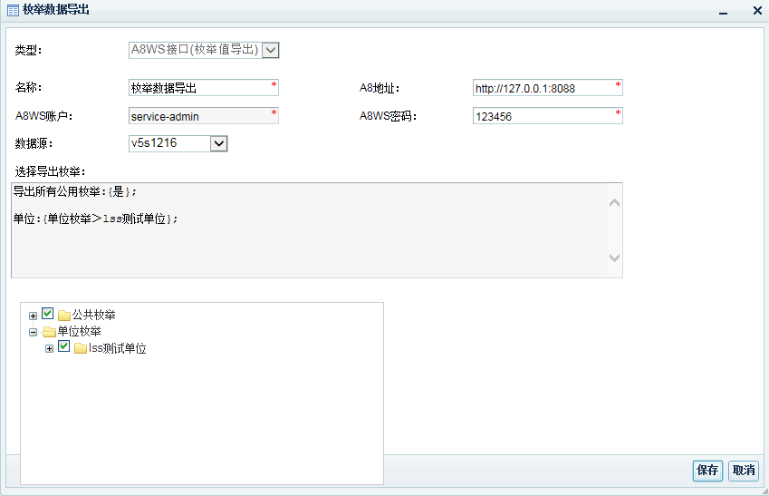图标,选择来源类型【A8接口(枚举值导出)】,填写名称,A8地址,A8WS账户,A8WS密码,选择数据源,选择要导出的枚举值。如图1