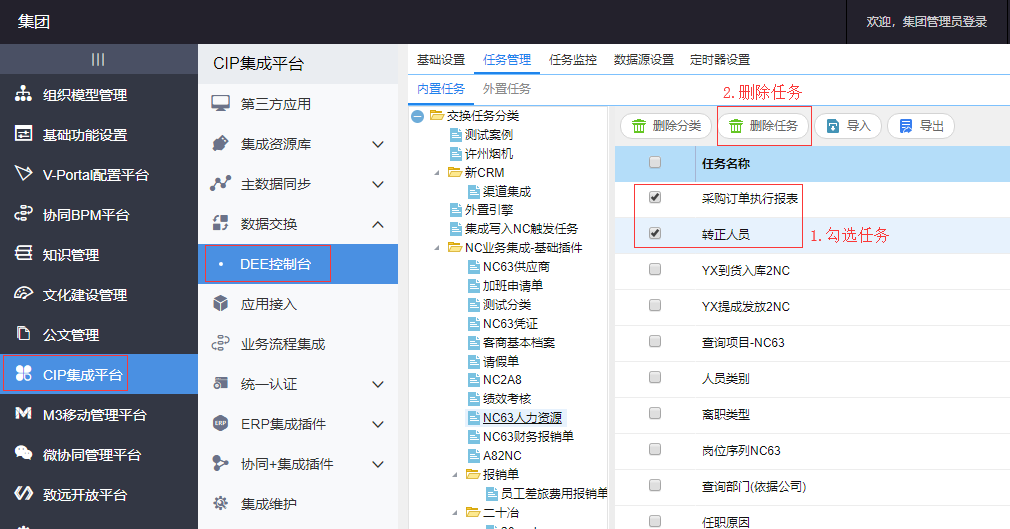 点击【任务管理】,选择任务分类,在任务中心列表,勾选需要删除的任务,点击删除按钮(已经启动的任务需要先停用在删除)