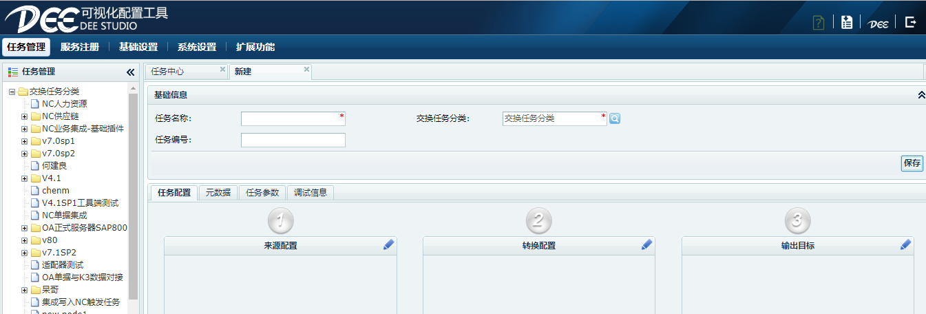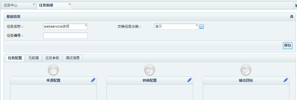 **第二步:**在任务中心页签中点击【新建】按钮,如图3,打开任务配置标签页,如图4;