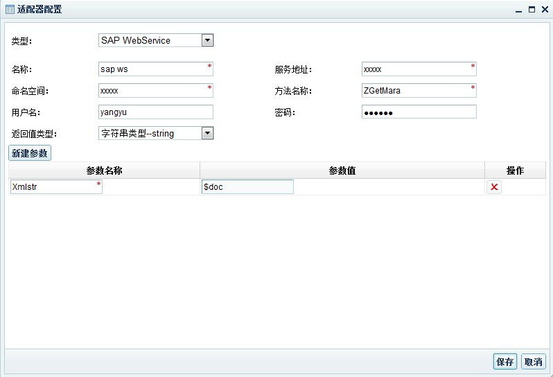 **第二步:**选择【SAP WebService】,填写名称,SAP WebService服务地址,命名空间,方法名称,用户名,密码,WebService返回值类型,入参名称,以及参数值。如图1
