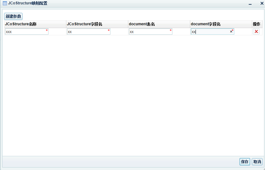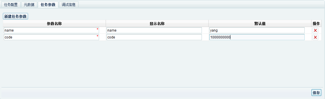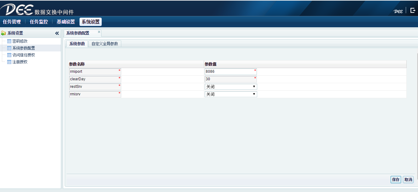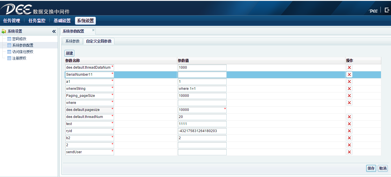 2.在自定义全局参数,点击新建,则添加一行空记录。输入参数名称及参数值,点击保存,将参数信息保存到配置文件dee-resource.properties。点击【X】删除记录,如图