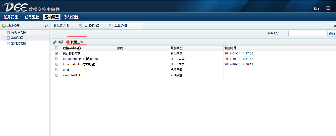 3.在字典管理页签中,选择一行或者多行记录点击【批量删除】会删除被勾选记录。其中列表中内置了一条UUID系统函数,该记录不能被删除也不能被修改。
