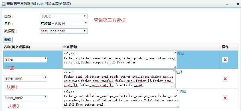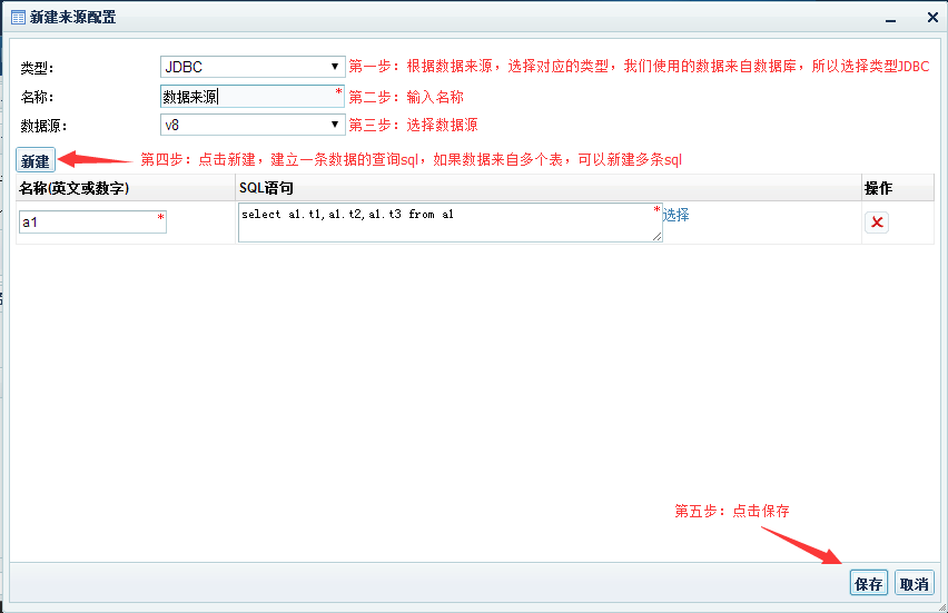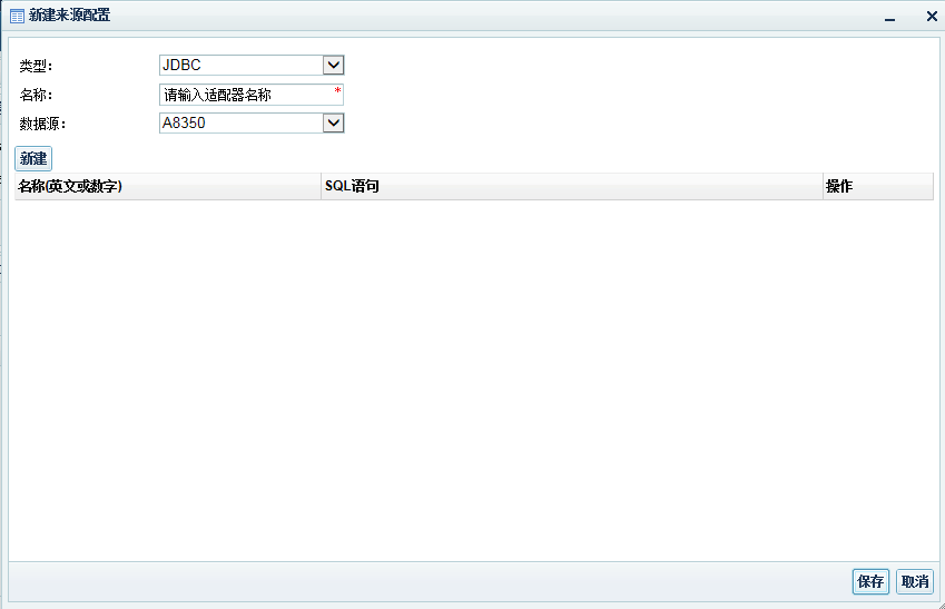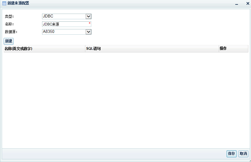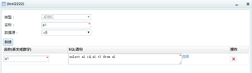 **第二步:**类型选择【JDBC】,填写名称,选择数据源,点击【新建】增加sql录入框,如图3;