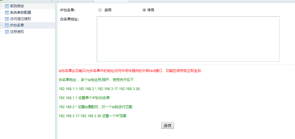 IP白名单此功能只允许名单中的地址访问中间件提供的外部rest接口,功能在保存后立即生效 。