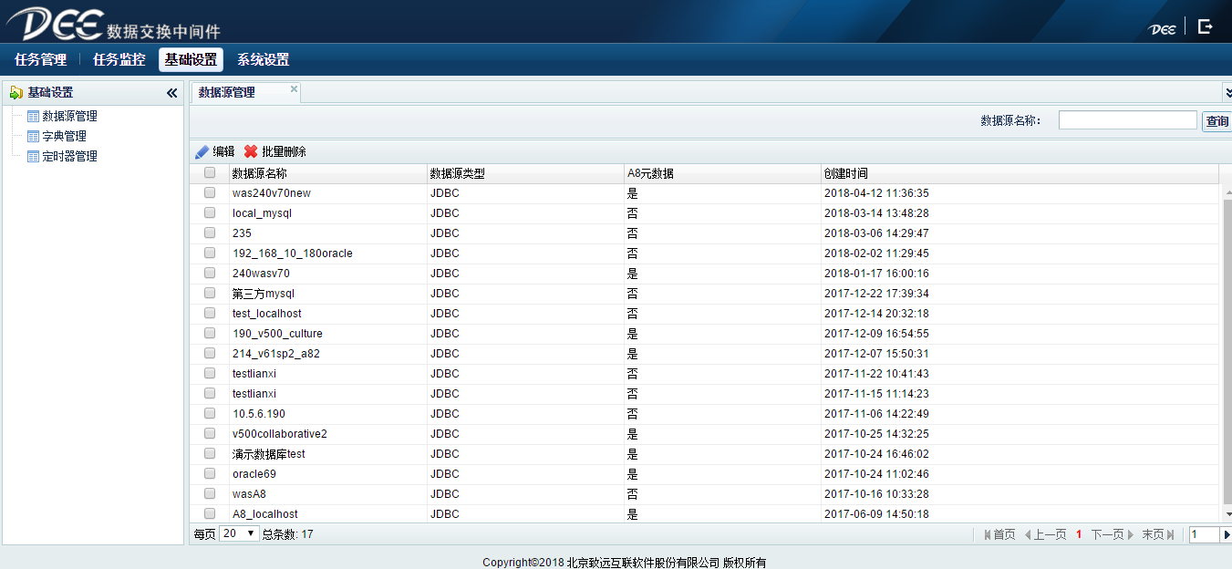 - 选择【基础设置】,将默认打开【数据源管理】页签