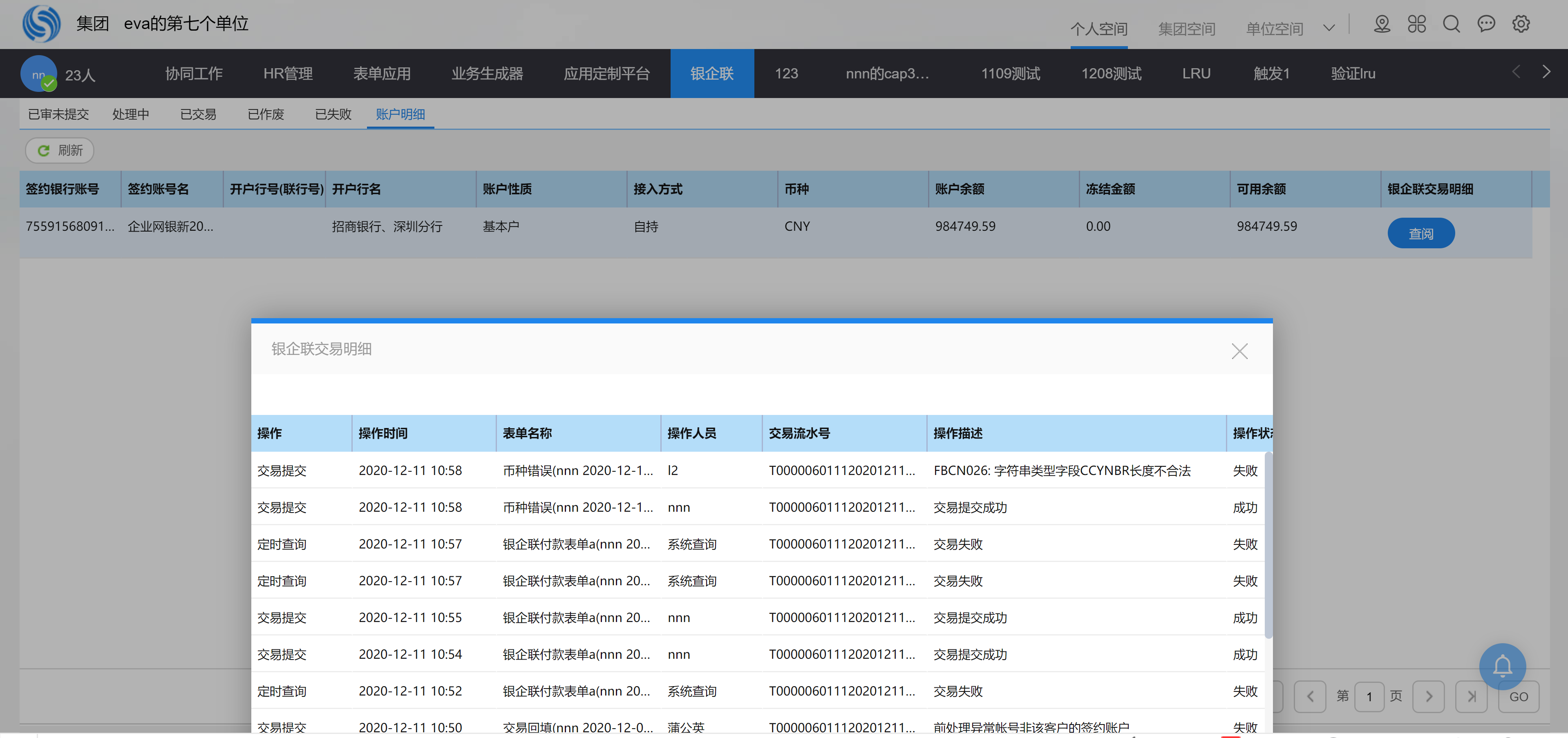 银企联交易台账:银企联交易员(单位角色)操作银联交易台账(提交、撤销、重发、作废、交易明细查询),完成实际交易。