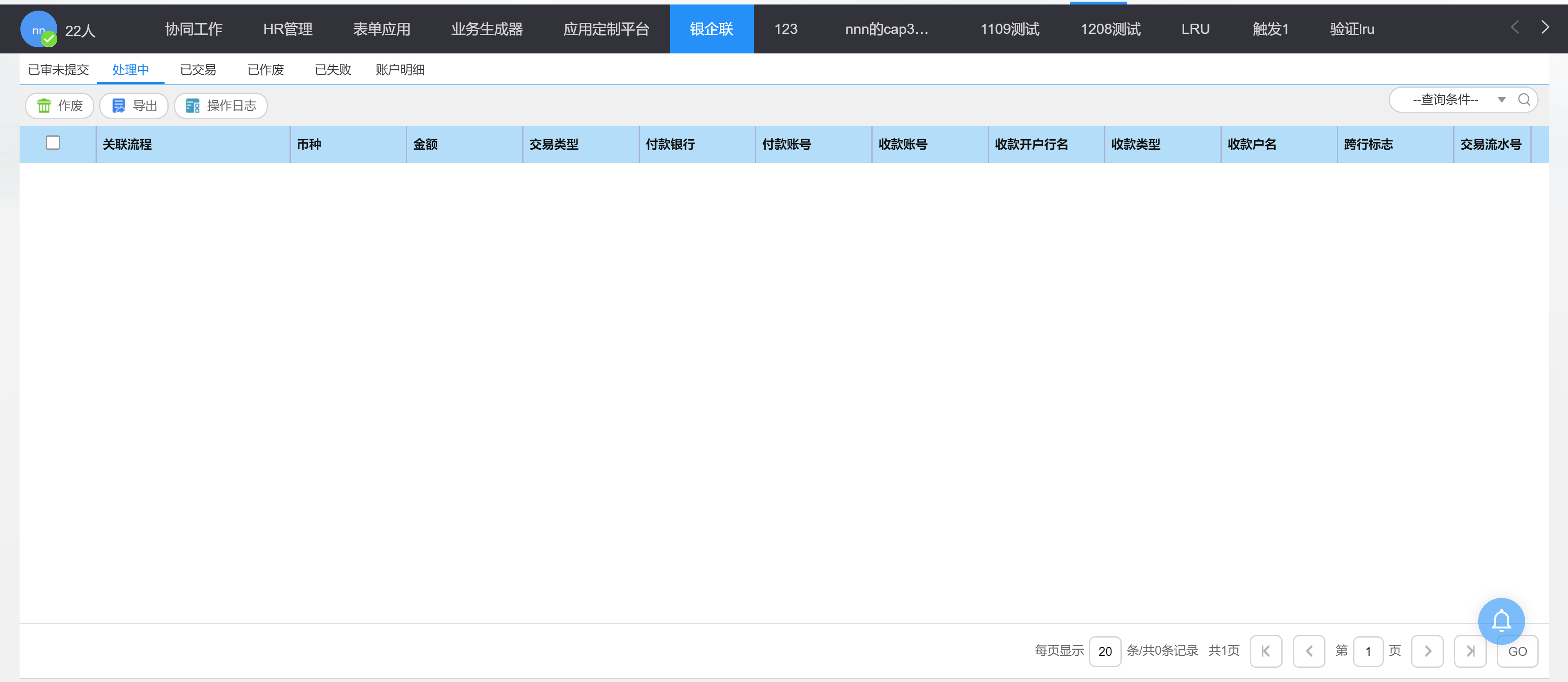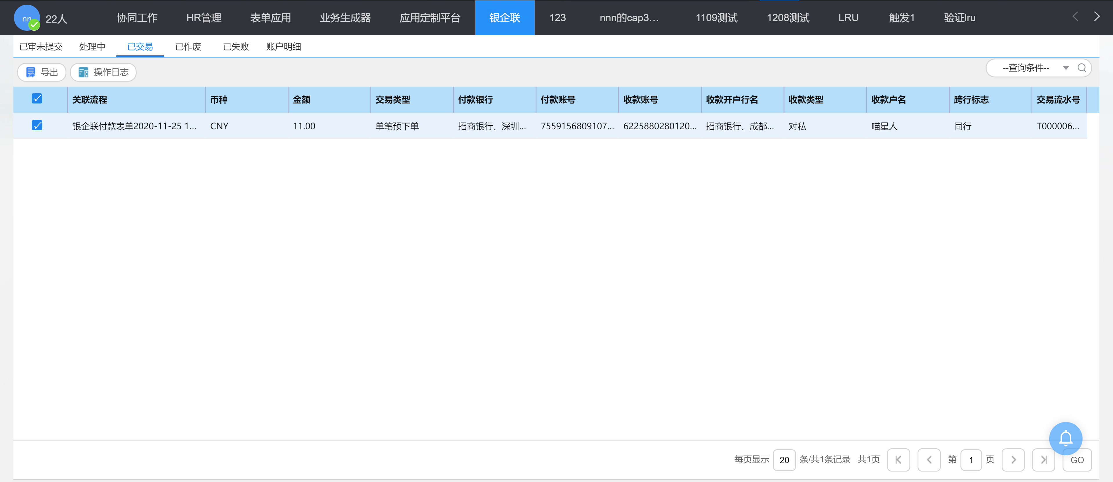 银企联交易员可以单选或多选(是否支持批量支付=是),点击"交易提交"推送交易请求到用友银企联平台。已提交交易迁移到"处理中"列表。