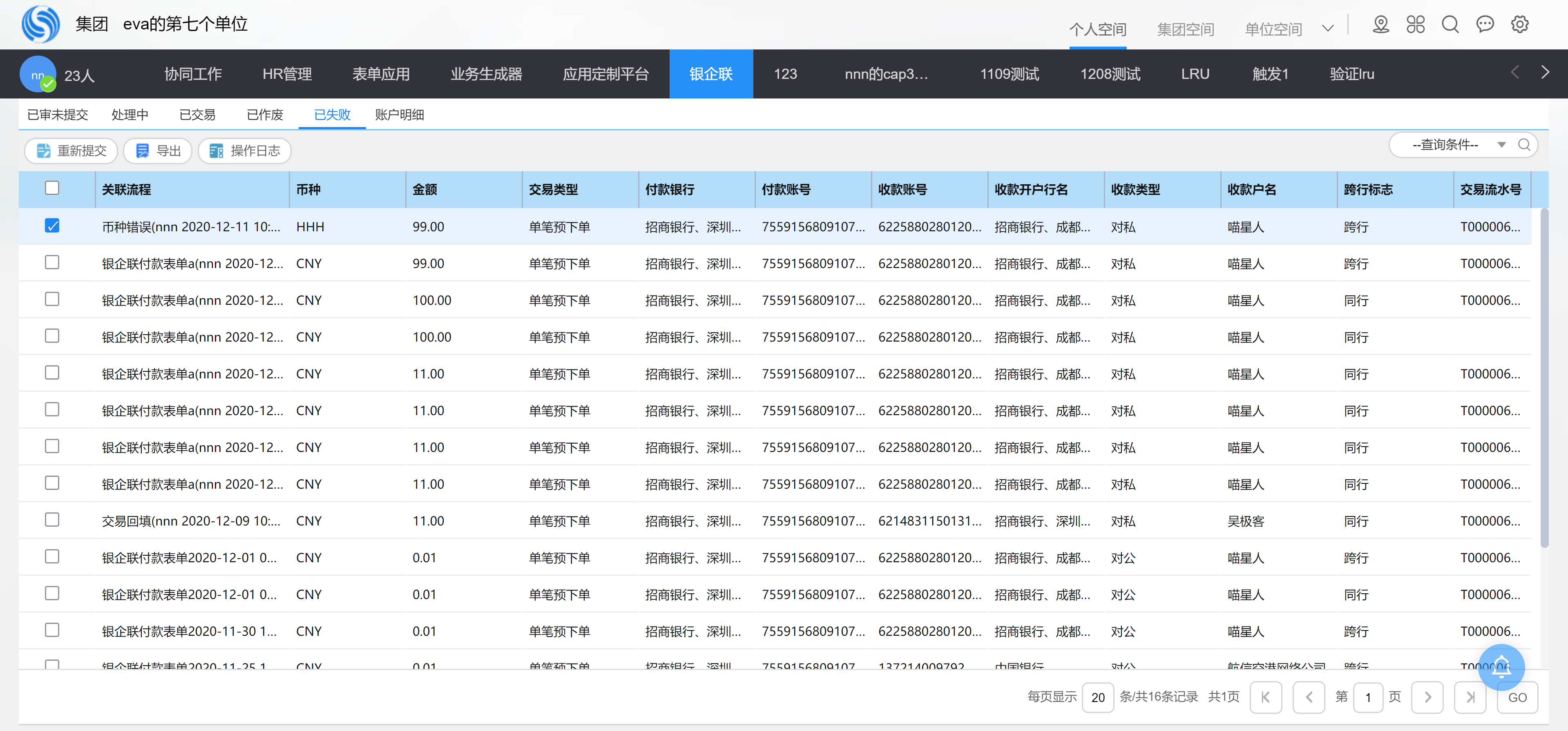 b. 否:则在银企联台账平台中,一次只能选择一条待交易数据提交。