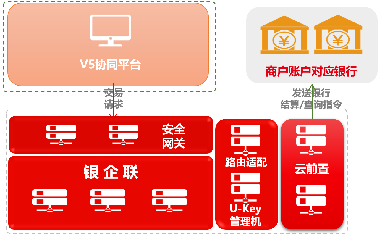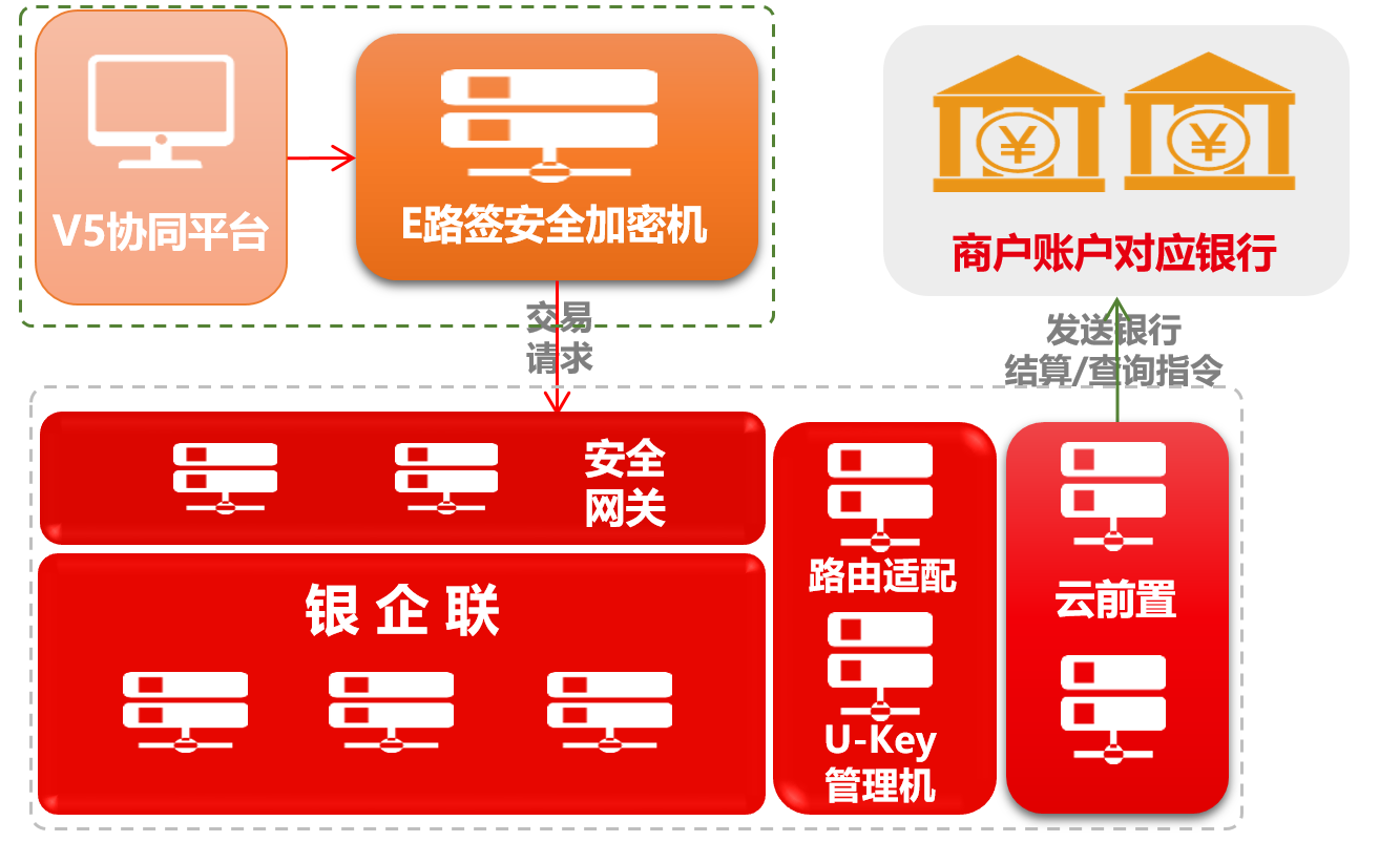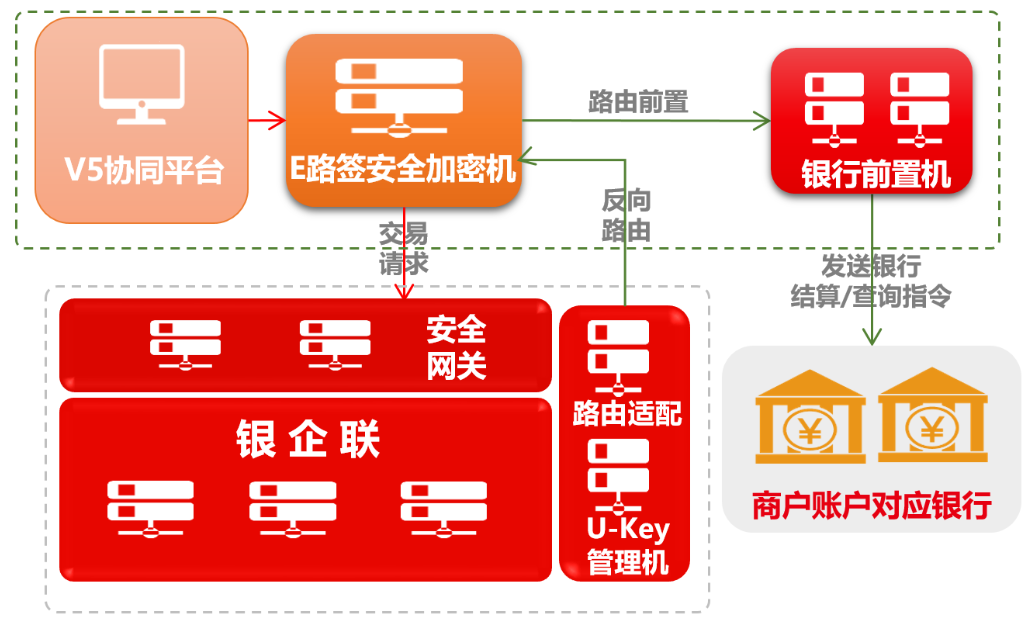 银行发放银企直联由用友融联平台托管,可通过E路加密机实现内外网隔离。