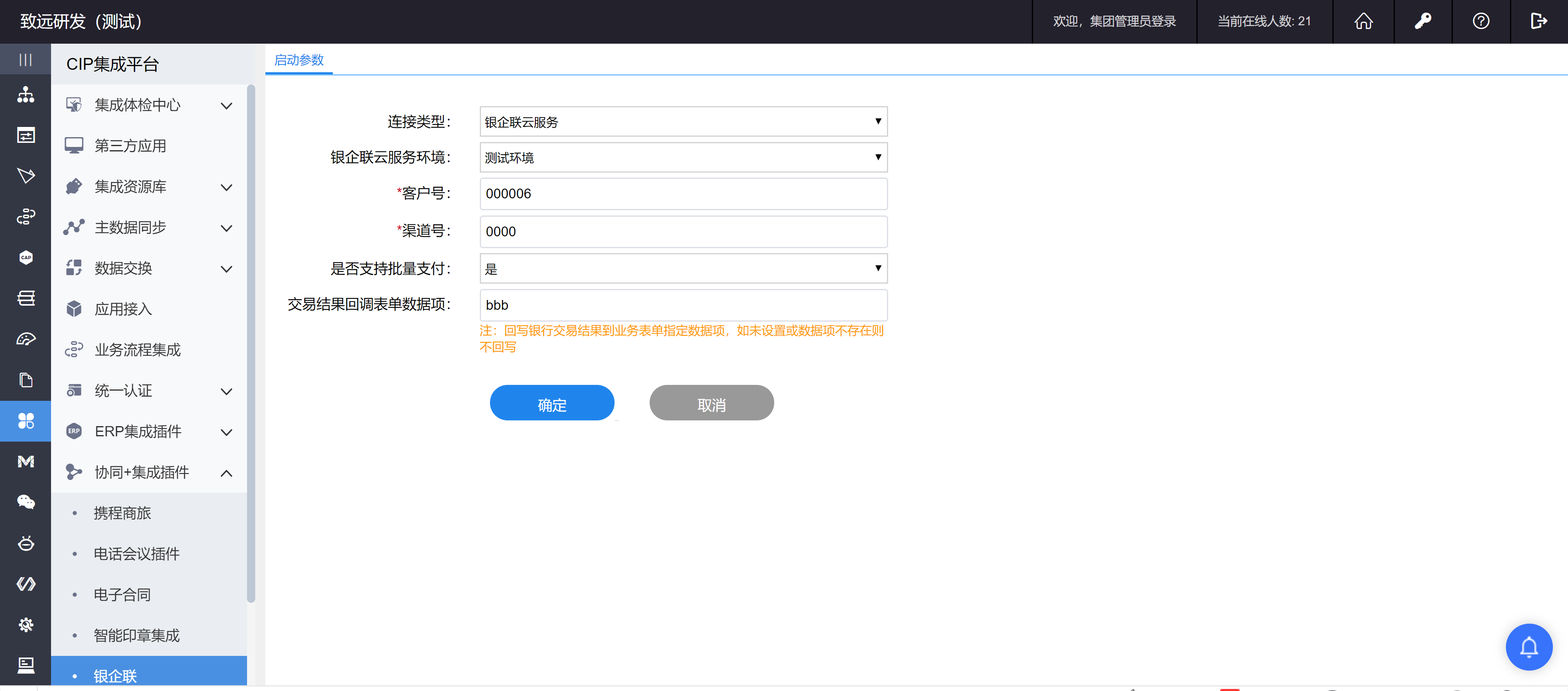 银企联由集团管理员(集团版)或单位管理员(企业版)配置用友银企联平台连接信息,见下图: