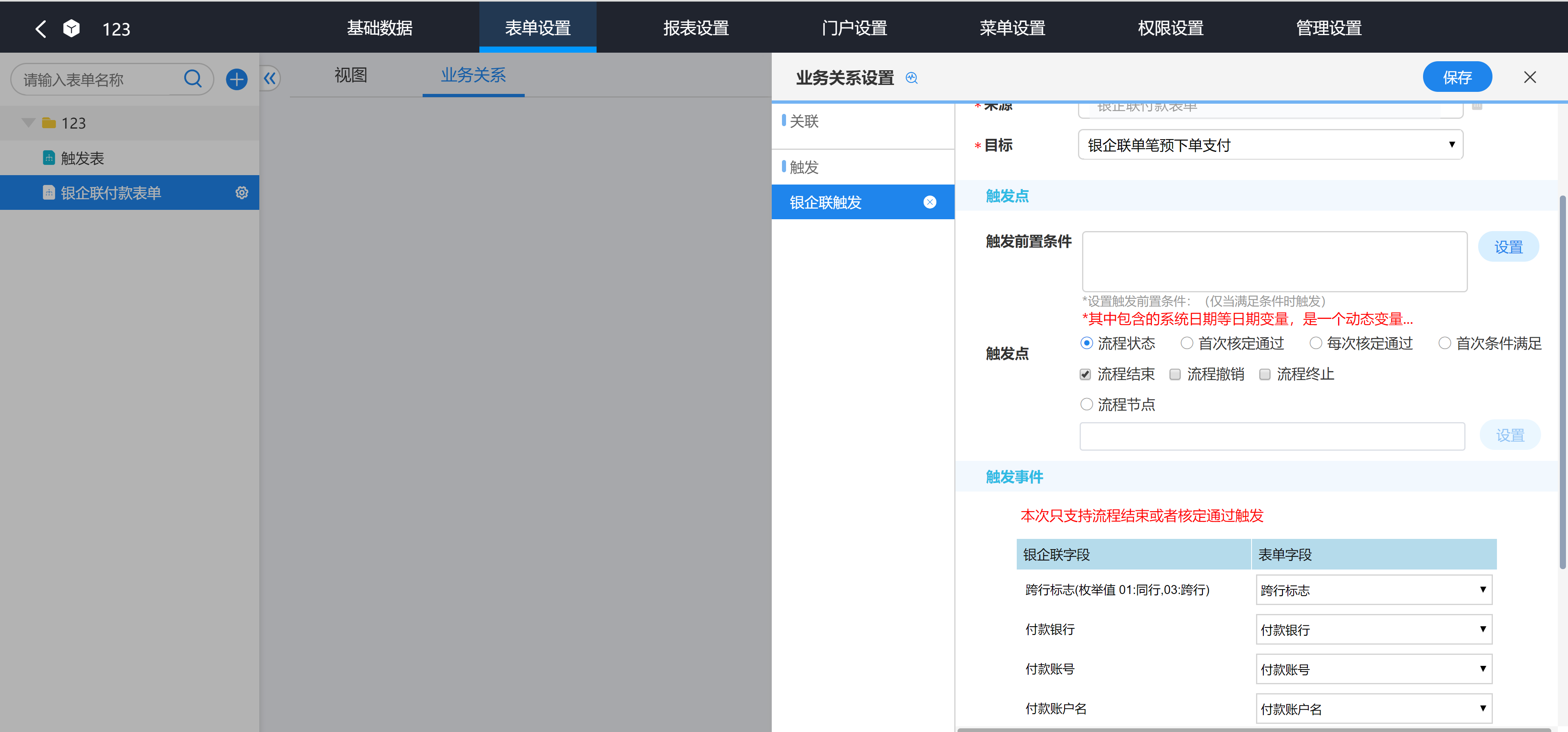 第四步:绑定当前业务表单数据项到银企联交易接口参数
