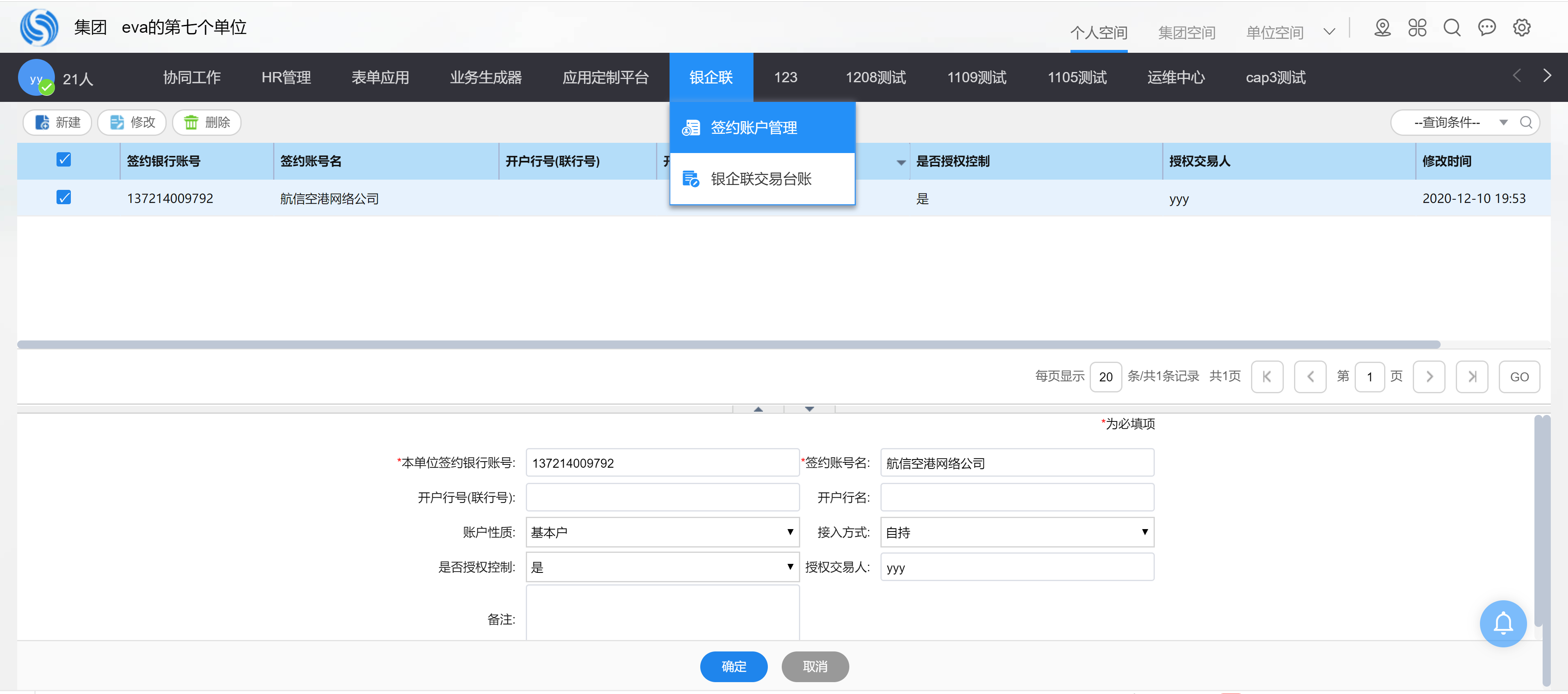 银企联交易员只能查看/处理已授权的签约账户交易。
