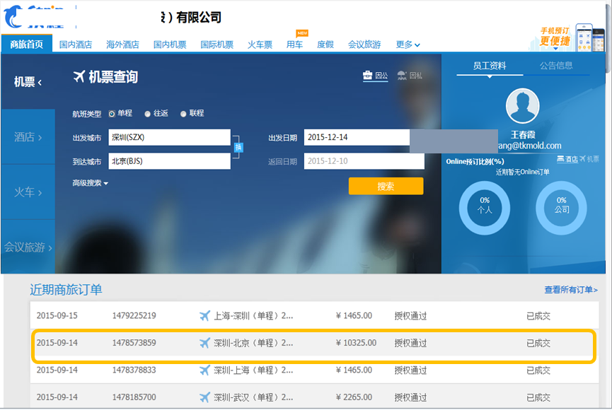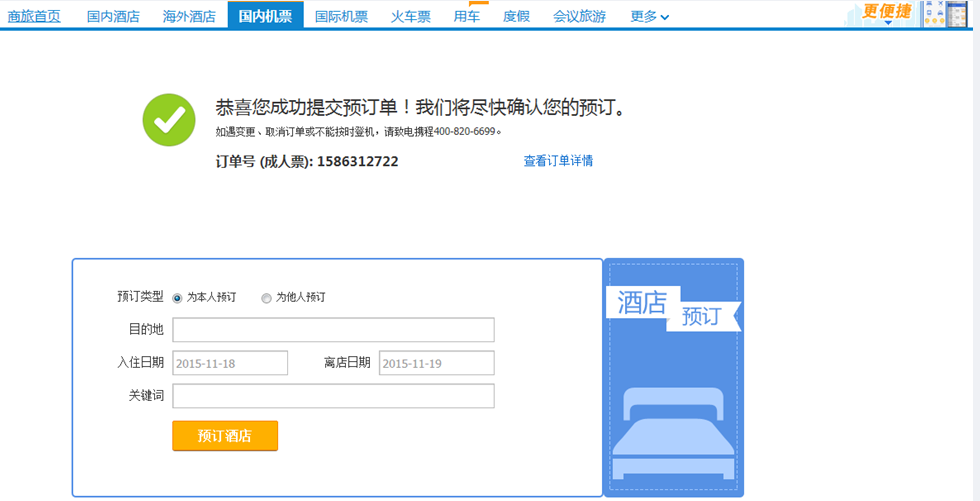 如果预订行程与审批单审核要素匹配,则订单直接提交成功,后台迅速出票。