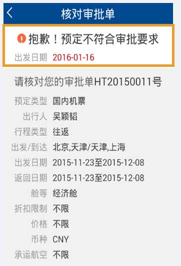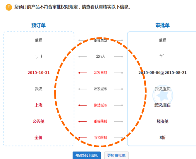 如预订与审批单不一致,系统会给出提示,无法订票。员工可返回上一步修改预订或重新选择审批单