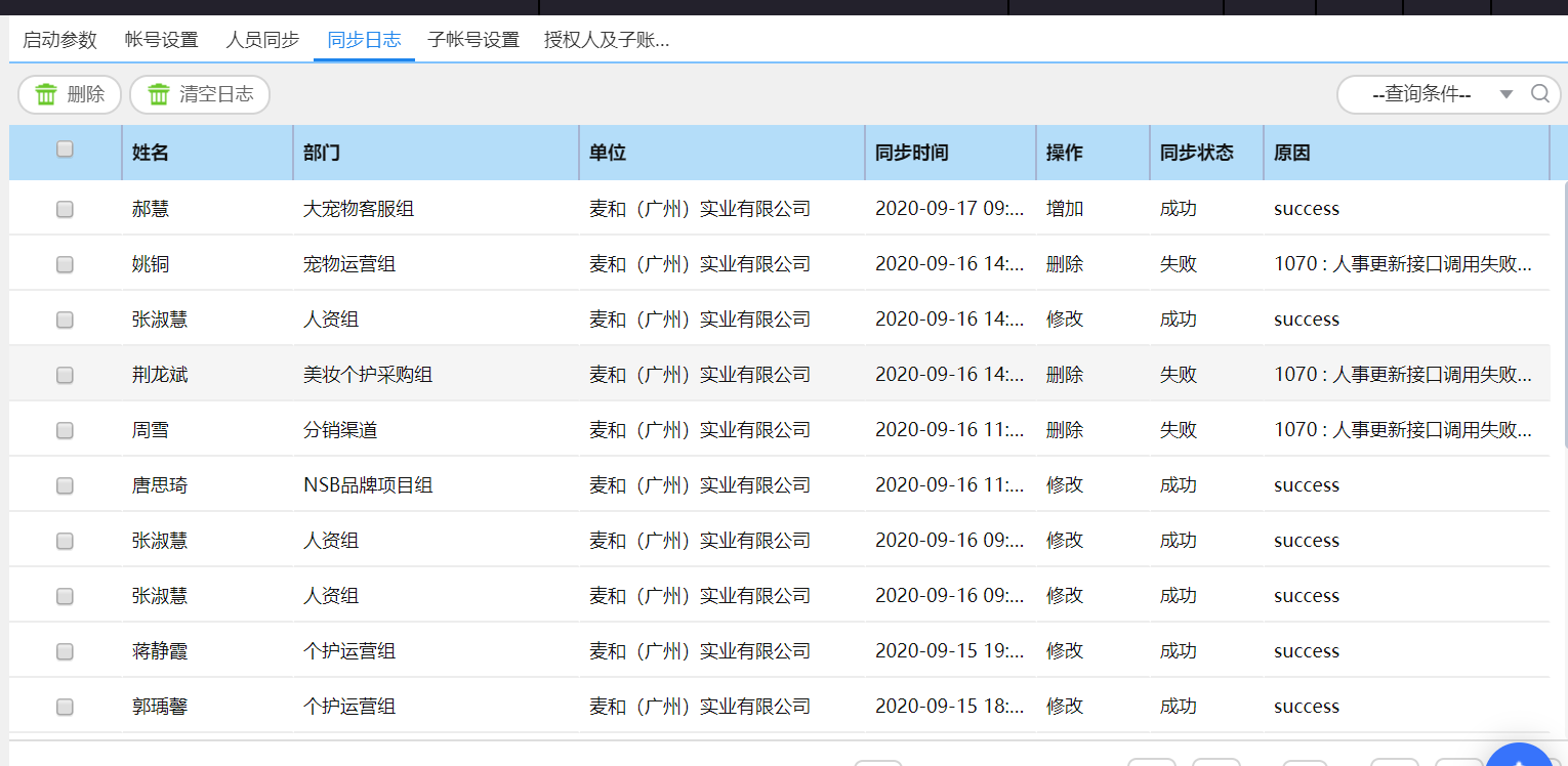 在携程集成配置中点击同步日志菜单,进入同步日志页面进行人员信息同步日志查看以及清理,如下图所示: