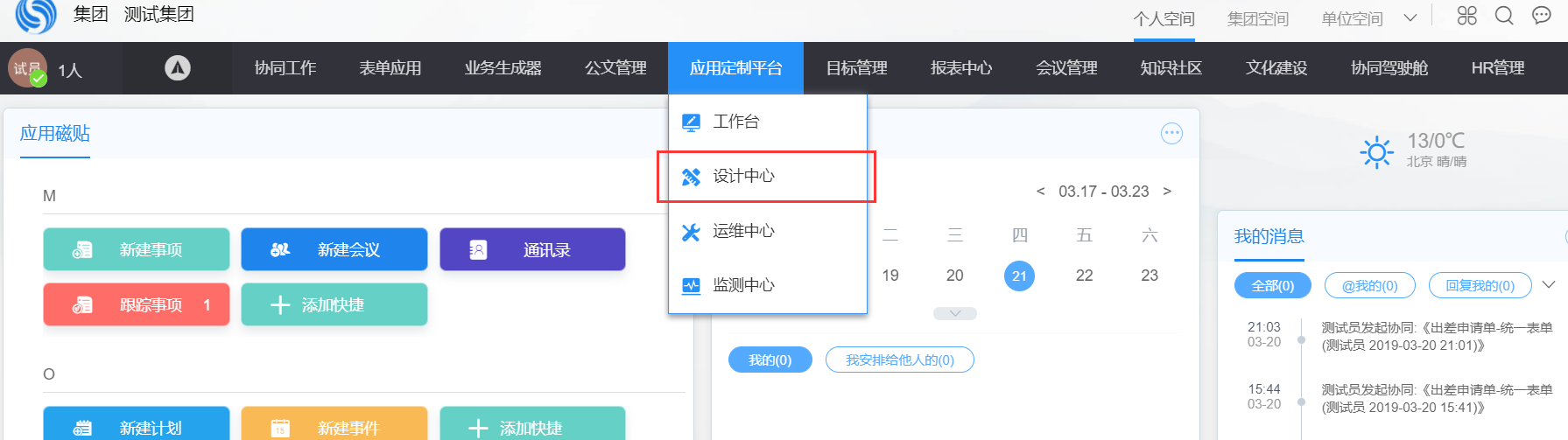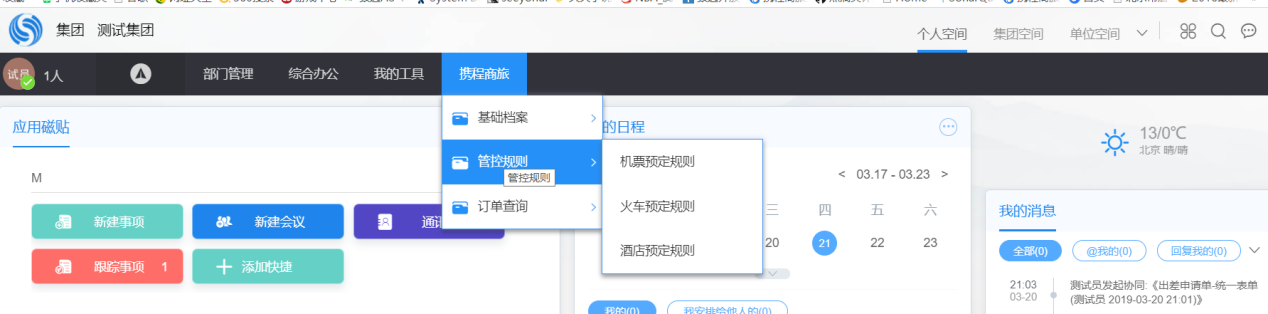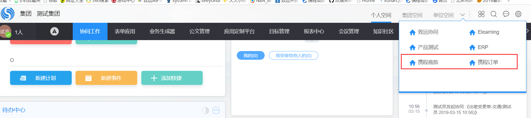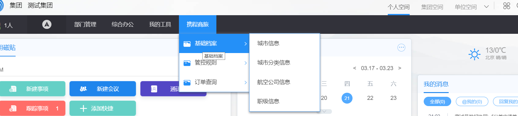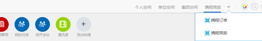 已经在携程系统中成功开户的OA账号登录协同,可见携程商旅的空间点击【携程订单】可单点登录至携程系统的"我的携程首页",点击【携程商旅】可单点登录至携程系统的订票页面,如下图所示: