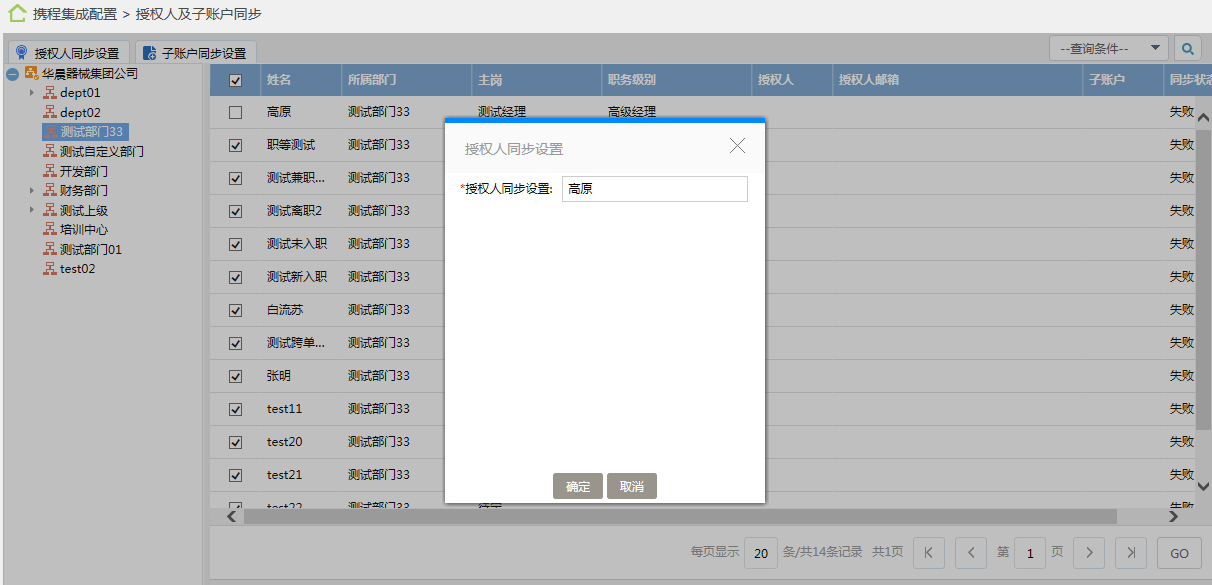 在人员列表中选择要设置授权人的员工,点击【授权人同步设置】按钮,弹出授权人选择页面,选择人员后点击确定按钮,将新设置的授权人更新到携程系统中,如下图所示: