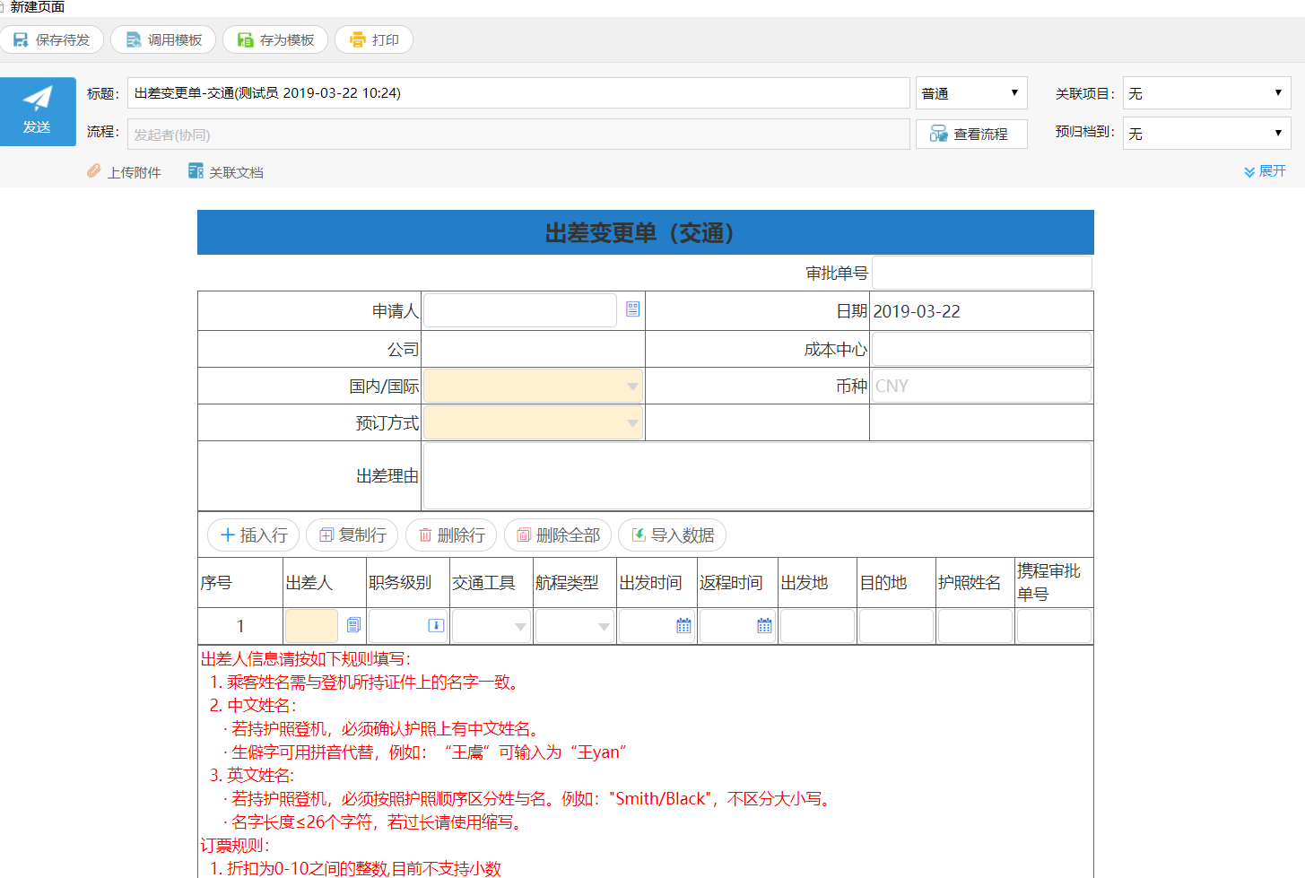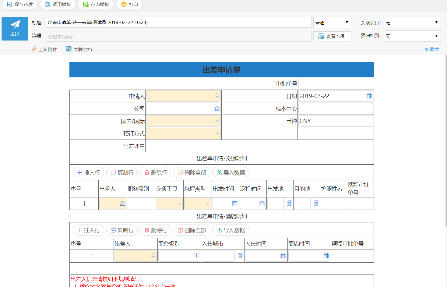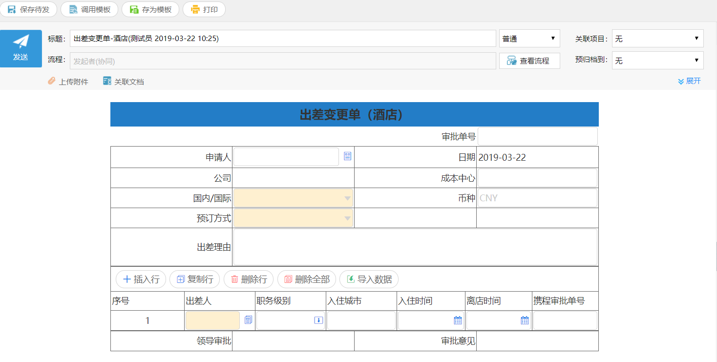 个人空间-我的模版中,员工点击"出差申请单",填写出差详细信息后发送至领导审批。